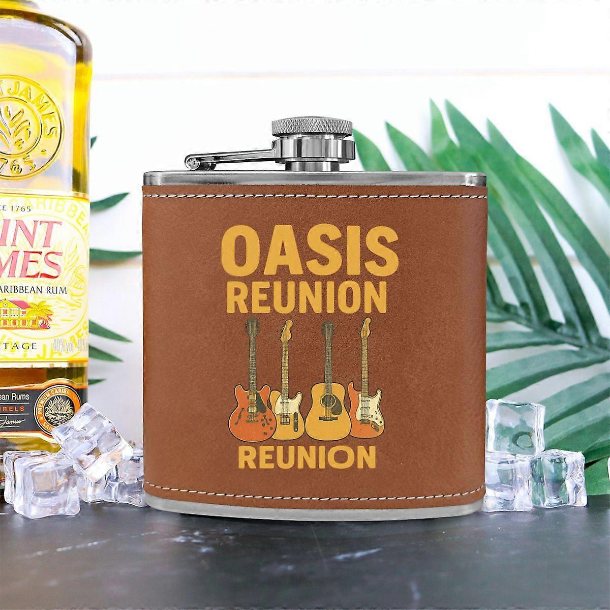 Oasis Reunion Stainless Steel Hip Flask 6oz Retro Pocket Flask with 19812025 Guitar Design Leather Wrapped Gift for Music Fans