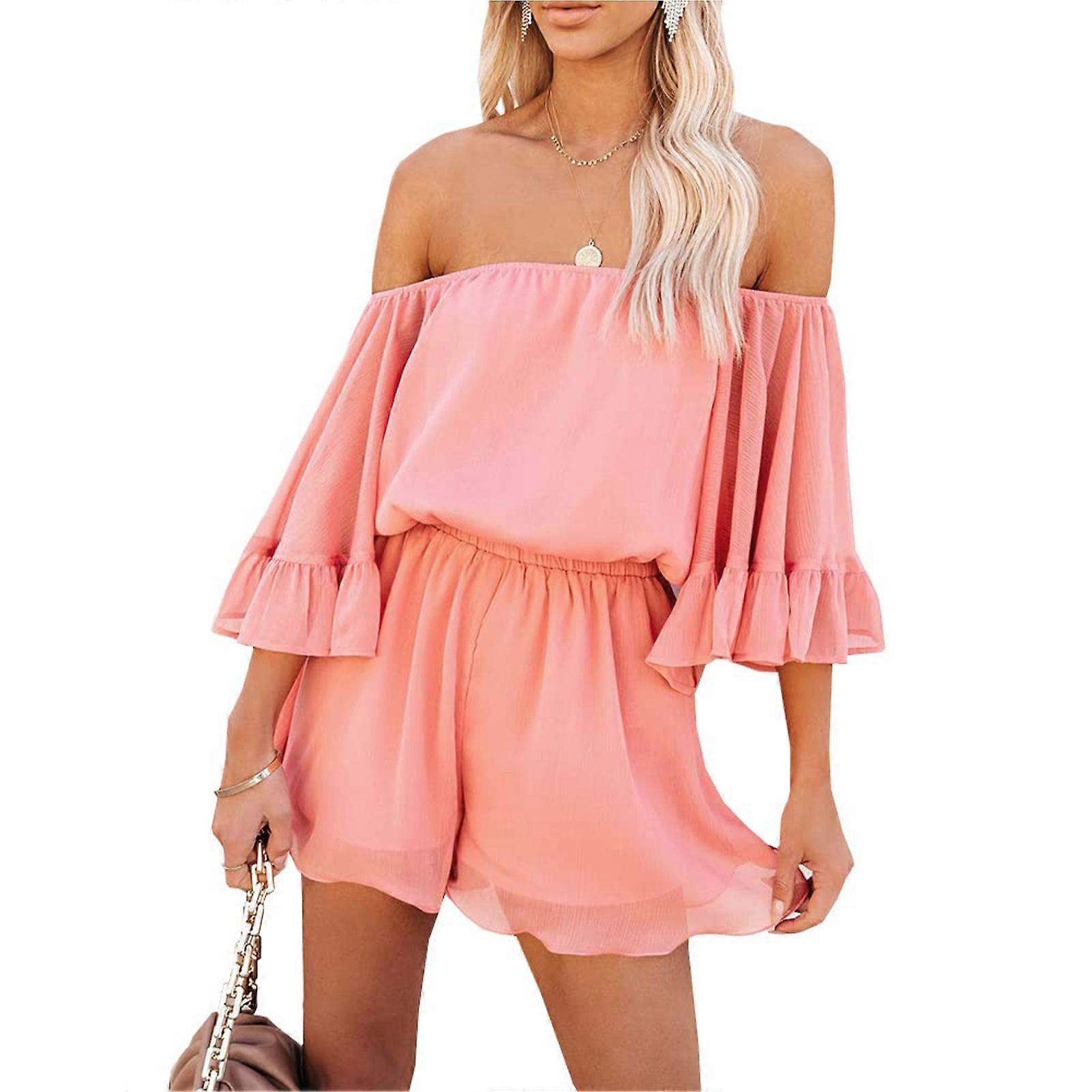 Off Shoulder Ruffle Sleeve Romper Women Summer Loose Casual Elastic Waist Chiffon Jumpsuit for Party Red L
