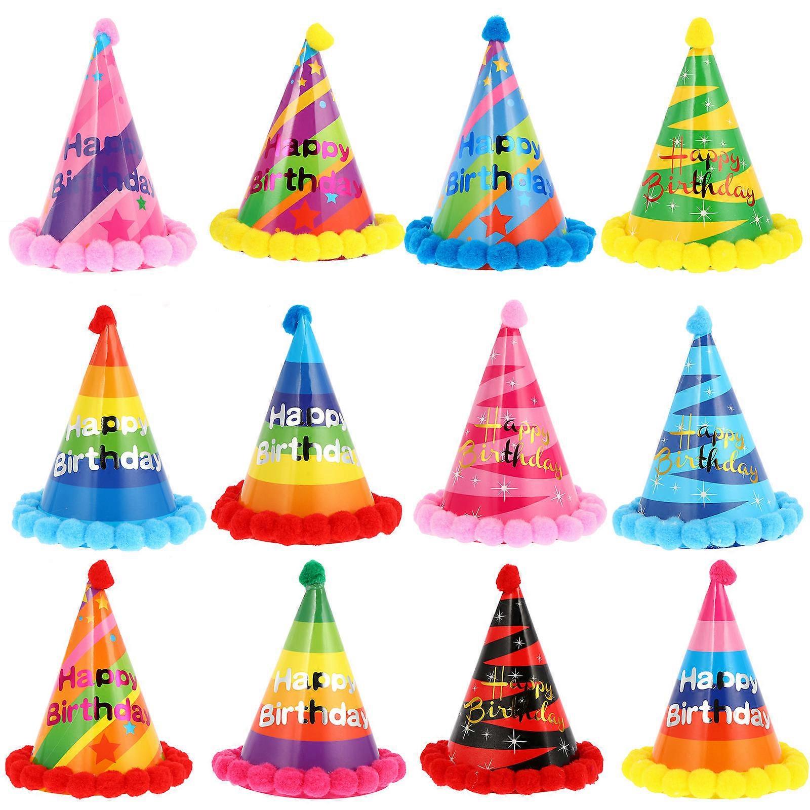 Cute Birthday Hats Paper and Plush Ball Children and Adults 19.5x14cm 12Pcs