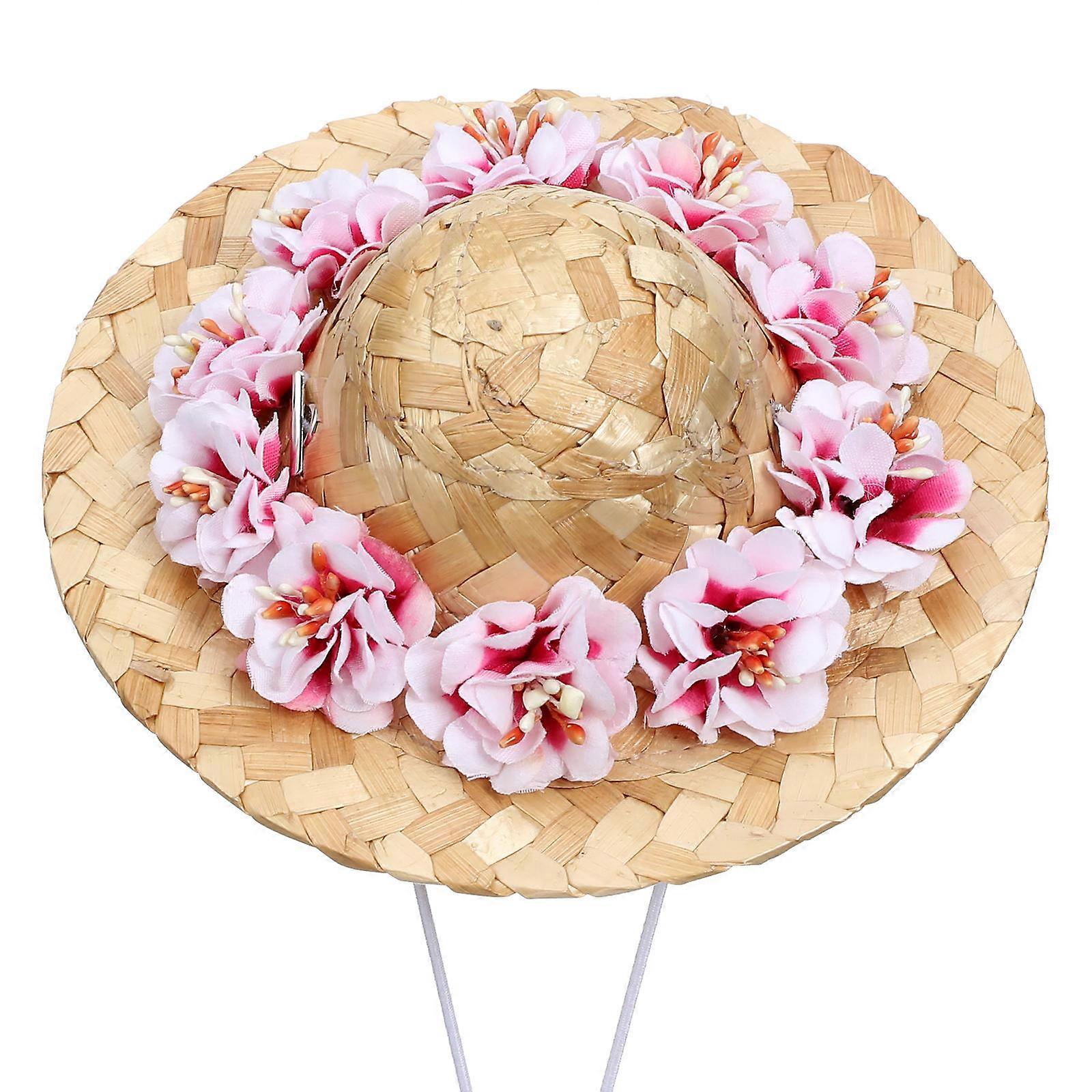 Dog Flower Hat Woven Sun Protection Cap with Chin Strap Pink Floral Design Costume Accessory for Spring Summer Photoshoots