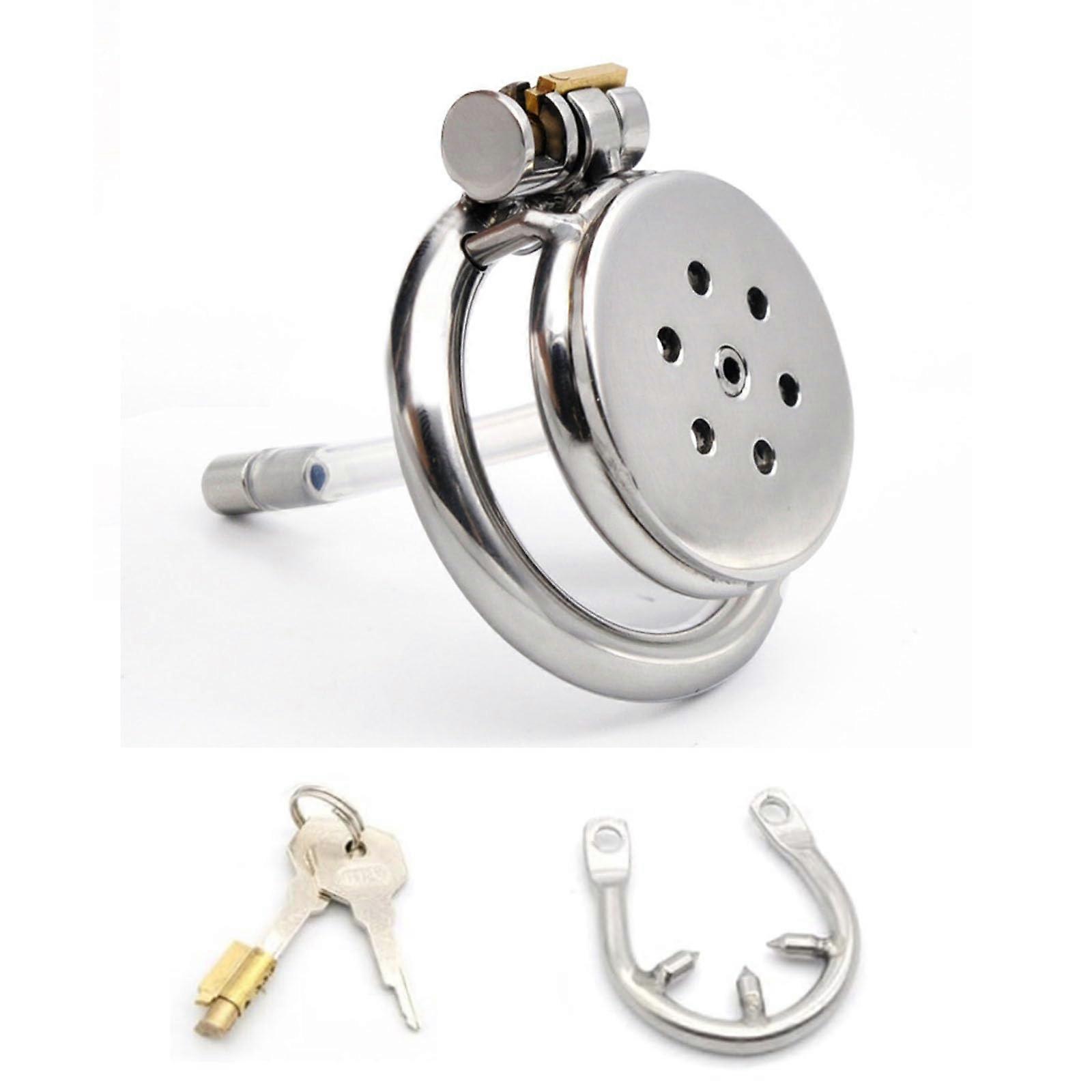 Flat Stainless Steel Chastity Cage DEHA09 With Urethral Plug, Anti-Off Ring, 45mm Flat Ring Silicone Tube Men Role Play