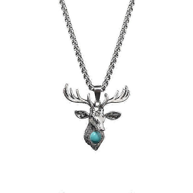 Reindeer Pendant Necklace for Men, Stainless Steel Deer Elk Pendant Necklace , Vintage Deer Head Antler Necklace Turquoise Stone Inlaid
