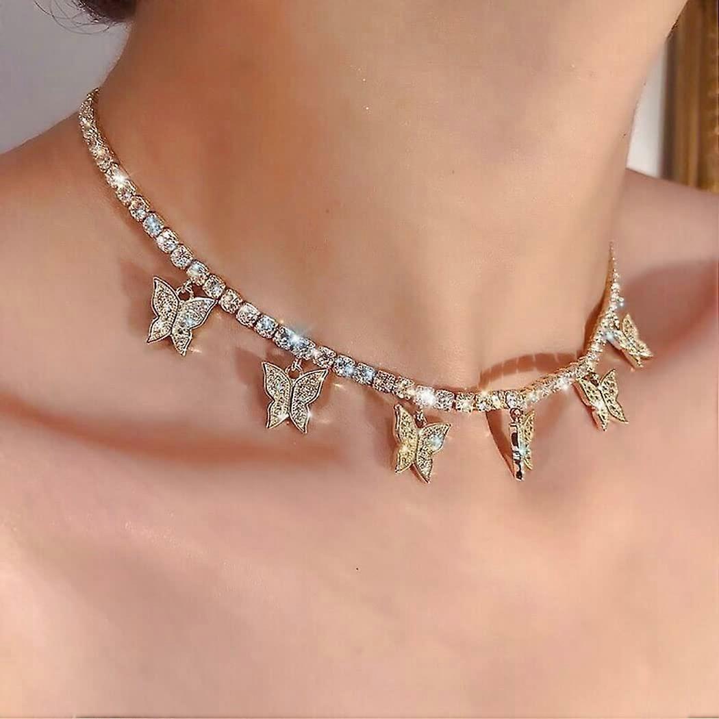 Butterfly Choker Necklace Crystal Pendant Sparkly Chain Jewelry for Women (Gold) (10584)