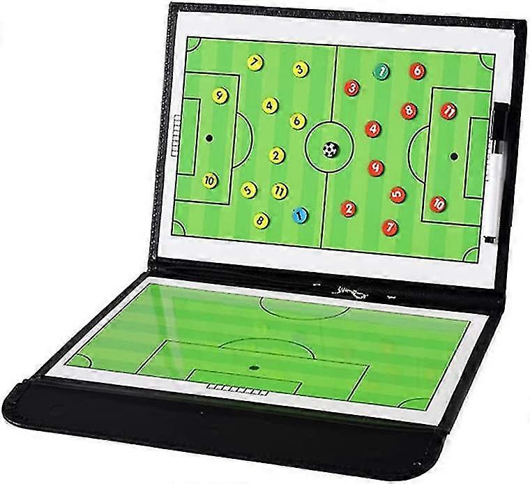 Superior Material: PU leather cover + Magnetic pitch + Write and wipe, 2 in 1 marker pen, giving you clear and vivid printing for coaching clipboard.^ Foldable and Easy to Use: Coaching Clipboard comes with 2 complete sets of magnetic markers so you can easily mark the formation for your team and the opposition. It is also can be folded when youre out.^ Plan Training: This tactics folder is great for devising match-day strategies and substitutions, but tactic board is also ideal to plan training sessions and help your team come up with innovative set-piece routines that bamboozle the opposition.^ Great Football Coach: As a great tool to make coaching strategy before every game, football Coaching Board is also a great way to explain and reinforce the fundamentals of football for your child.^ Write and Wipe: This football coaching board with a whiteboard marker pen can be erased after writing, leaving no trace, durable to use.