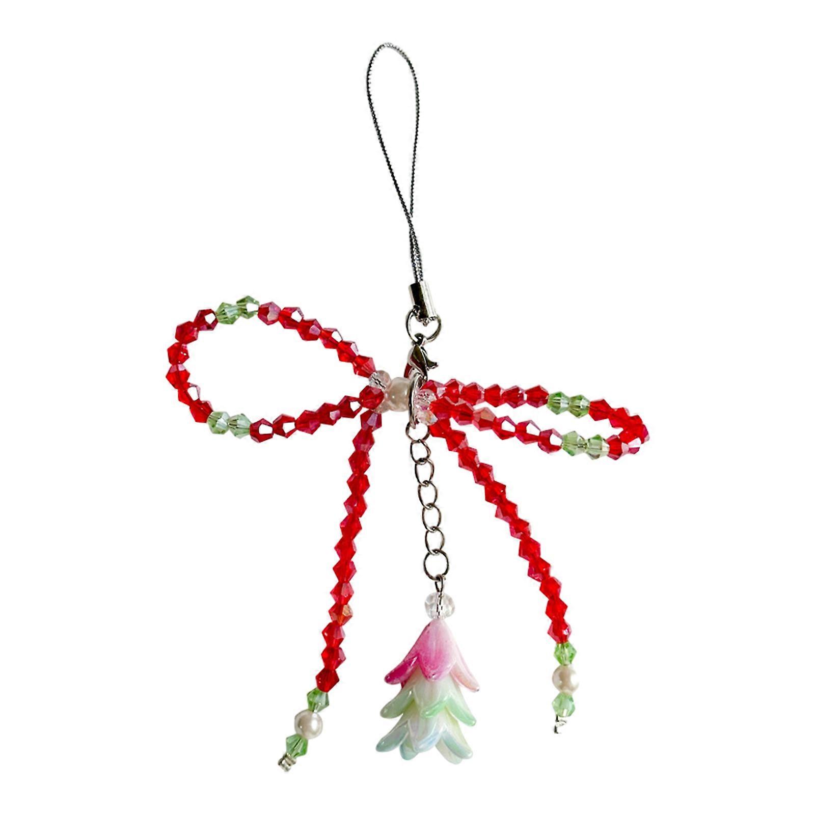Crystal Beaded Phone Lanyard Bowknot Pendant Wrist Strap Detachable Phone Chains Keyring Portable Accessory for Women Red