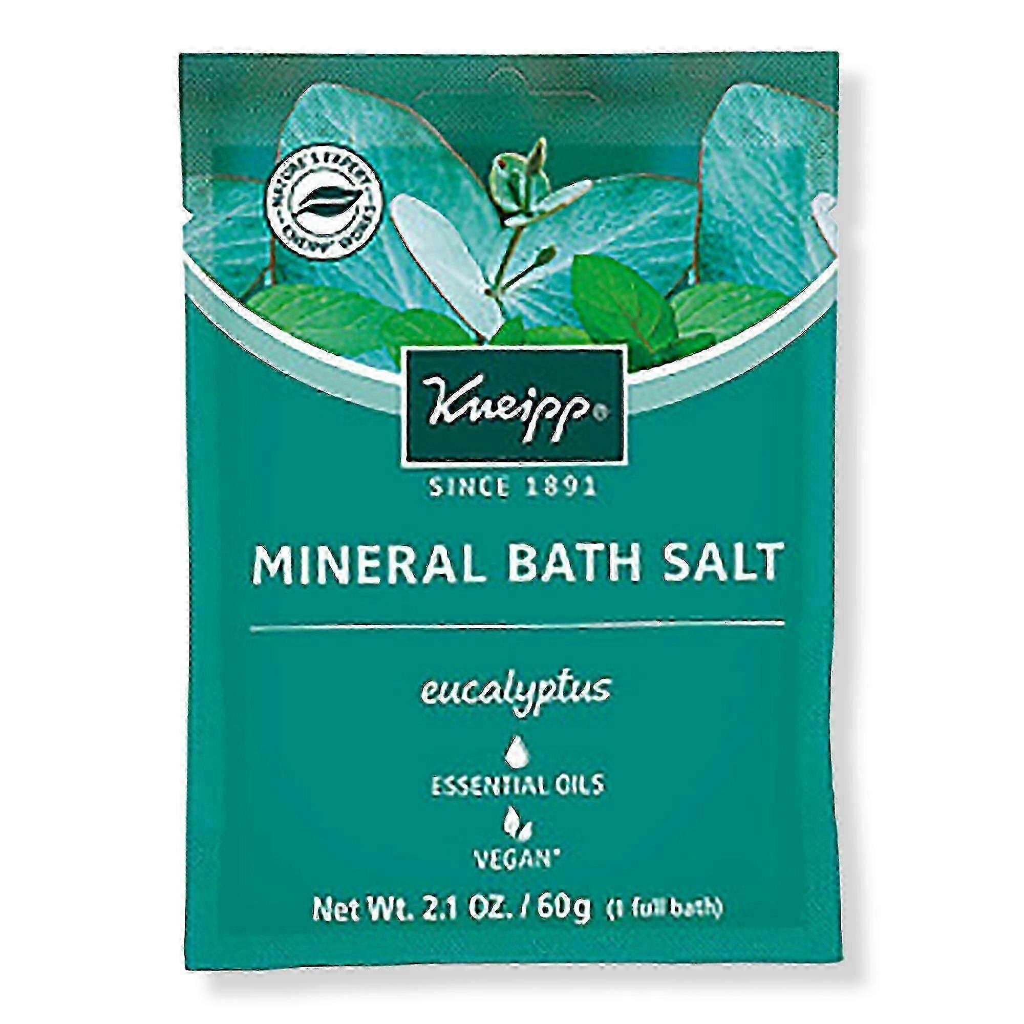 Close your eyes and breathe in the benefits of Kneipp's Refreshing Eucalyptus Mineral Bath Salt Soak, powered by essential oils. Emerge feeling renewed.BenefitsA salt soak unlike any other: contains exclusive, pure salt sourced from an ancient ocean hidden deep below the EarthEucalyptus Essential Oils help restore, uplift, and invigorate when you need it mostPacked with trace elements and minerals to benefit and intensely smooth your skinUnique salt crystal structure naturally absorbs more essential oils than smaller grain salt, allowing for a more concentrated and effective bath infusionMix with Kneipp's Refreshing Eucalyptus Herbal Bath Oil for an intensified color and aromatherapy experiencegives 1 full bath - ideal for trial or travelMade with Clean Ingredients by Kneipp, celebrating 130 years of bath expertiseFormulated WithoutParabensPhthalatesSiliconesPetrolatumParaffinMineral OilSuggested Use: Add entire contents of bath salt sachet to bath water. Enjoy bath for 15-20 minutes - water temperature: 97-100 degrees F/36-38 degrees C. Precautions: Hot or warm soaks should not be used by individuals with diabetes, except on advice of physician. For external use only. Do not ingest. Use only as directed. Keep out of reach of children. If irritation occurs, discontinue use. Consult a physician if irritation persists. If product enters the eye, wash out thoroughly with plenty of clean water.Expiration Date: We have fresh stock each week with exceptional expiration dates prior to APRIL 2024. Products will expire no later than six months to 1 year after receipt.Product Packaging: Please note that some manufacturer may often change their packaging. This product may arrive different from what is pictured. We will always ship the most up-to-date packaging to our customers. Please contact us if you have any questions about this product or would like to request an older version of this product.Healthcare Disclaimer: Content on this site is for reference purposes only. OTC Shoppe Express does not represent or warrant that the nutrition, ingredient, allergen and other product information on our Web or Mobile sites are accurate or complete, since this information comes from the product manufacturers. On occasion, manufacturers may improve or change their product formulas and update their labels. We recommend that you do not rely solely on the information presented on our Web or Mobile sites and that you review the product's label or contact the manufacturer directly if you have specific product concerns or questions. If you have specific healthcare concerns or questions about the products displayed, please contact your licensed healthcare professional for advice or answers.