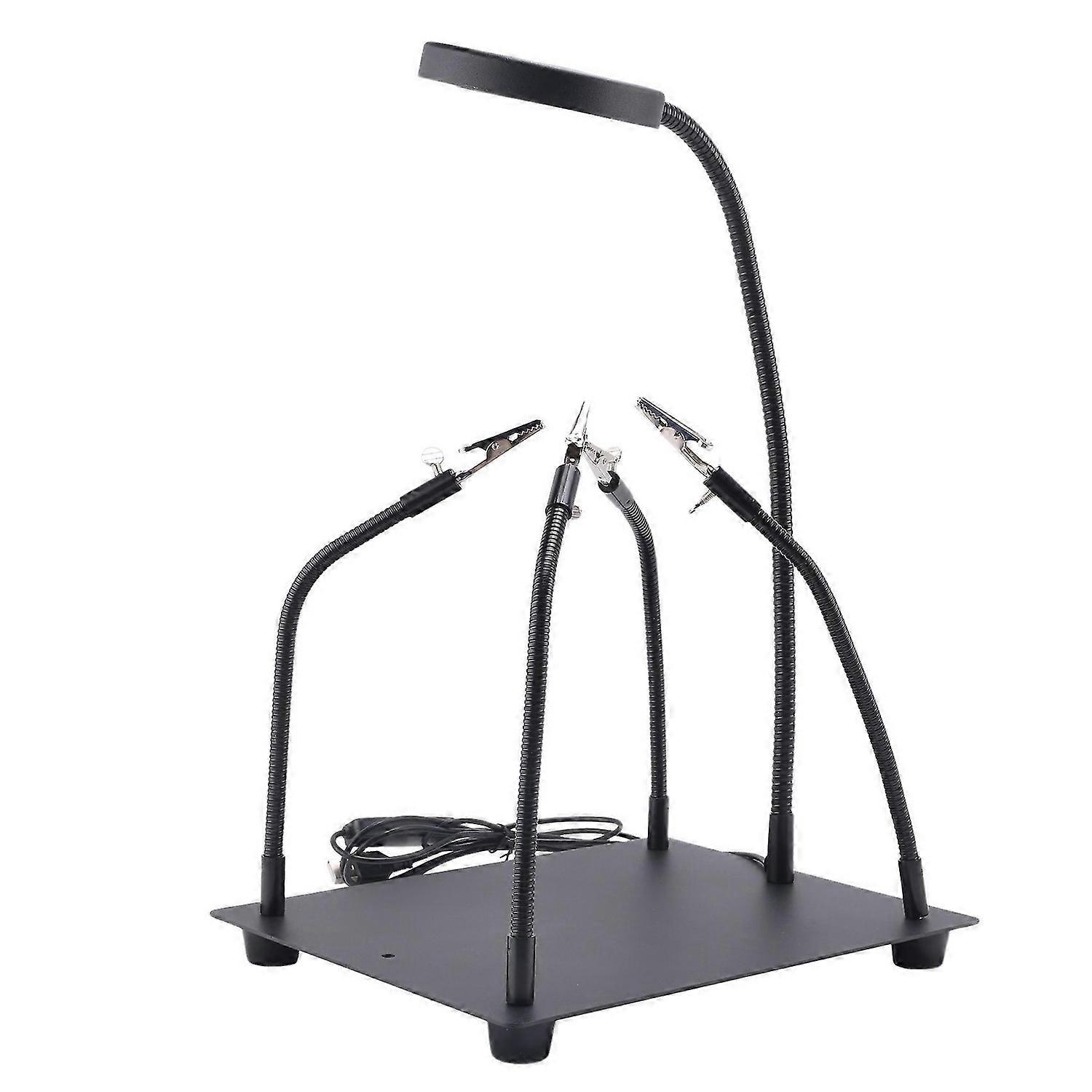 The LED lights have 10 brightness levels and 3 bright colors. Triple magnification real glass lenses help you see details or small things, improve your work accuracy and efficiency, and protect your eyes from stress. 4 flexible metal gooseneck arms can rotate 360 degrees. With the help of a knurled nut, the arm can be locked. So the arm can be clamped in any position. Comes with 4 insulated high temperature alligator clips. The alligator clip is fixed with screws, which makes the alligator clip stronger, not easy to fall off, and can be rotated 360 degrees. Each clip comes with a removable rubber cover, which means you can avoid scratching the polished of your jewelry or avoiding short circuits. The indestructible body adopts anti-slip rubber pads to high stability and not slip and prevent tipping. This is the perfect tool for professionals and amateurs alike. Welding set, perfect for welding, assembly, maintenance, model making, hobbies, jewelry and crafts. Featuring strong yet flexible metal tube arms and a dimmable magnifying glass to place the board exactly where you want it.<br><br>Material: Metal colour: black<br><br>Package Contents: 1 x Third pointer welding tool<br><br>Only the above package content, other products are not included. Note: Light reflection and different displays may cause the color of the item in the picture a little different from the real thing. The measurement allowed error is +/- 1-3cm.