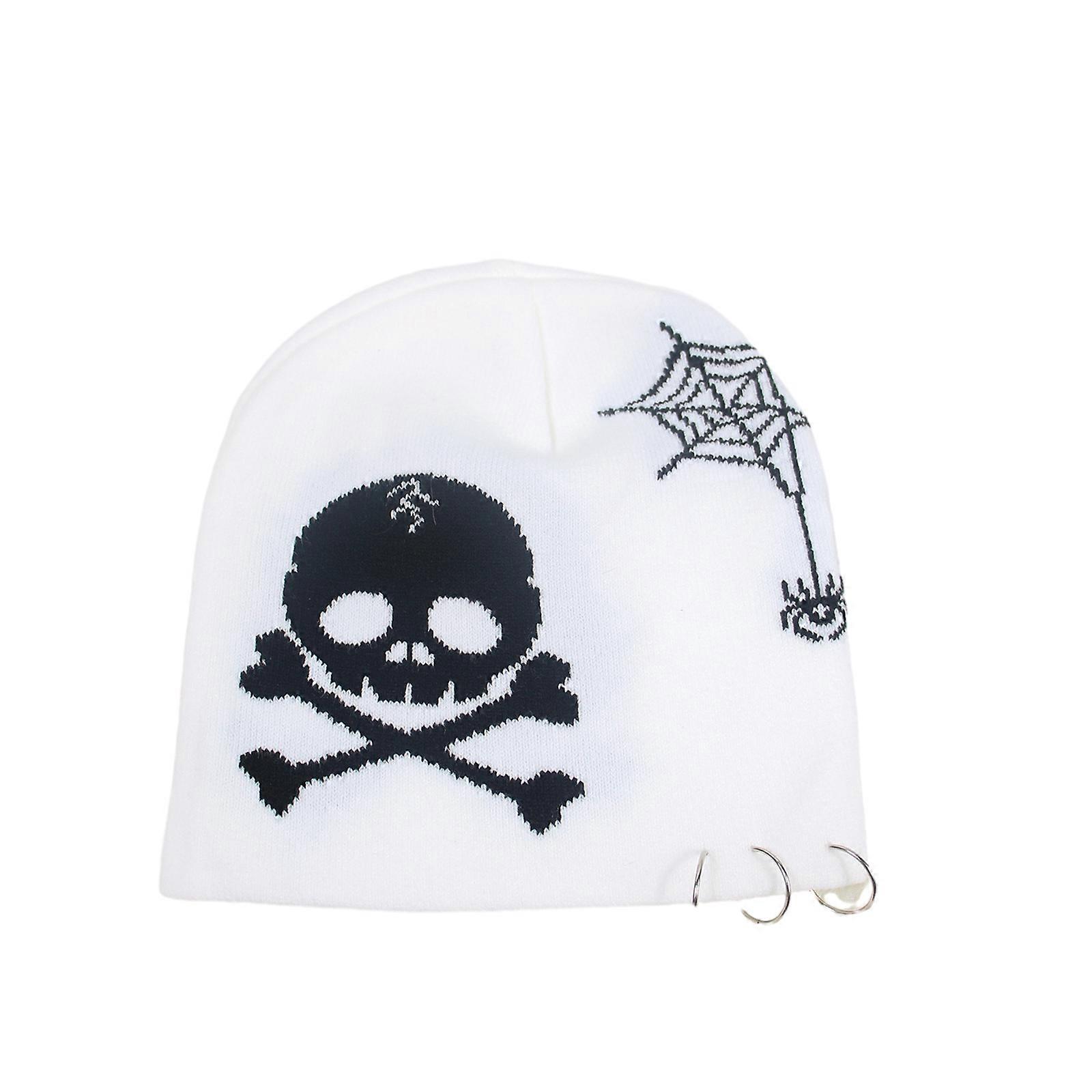 Unisex Beanie Gothic Skull Crocheted Hip Hop Hat for Women Men Picture Props Bone Cobweb Jacquard Halloween Party White