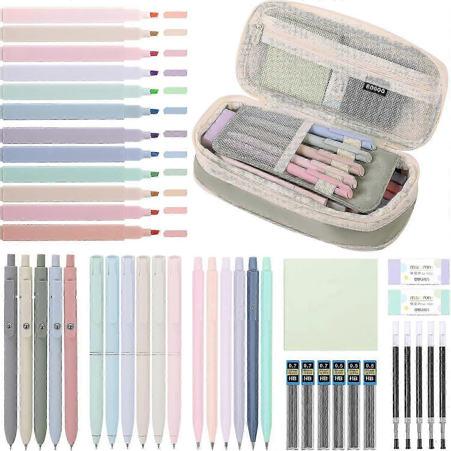 Cute School Supplies 44 PCS, Aesthetic Pencil Case with 12 Pastel Highlighters, 5 Black Gel Pens, 6 Color Gel Pens & Mechanical Pencils, College Essen