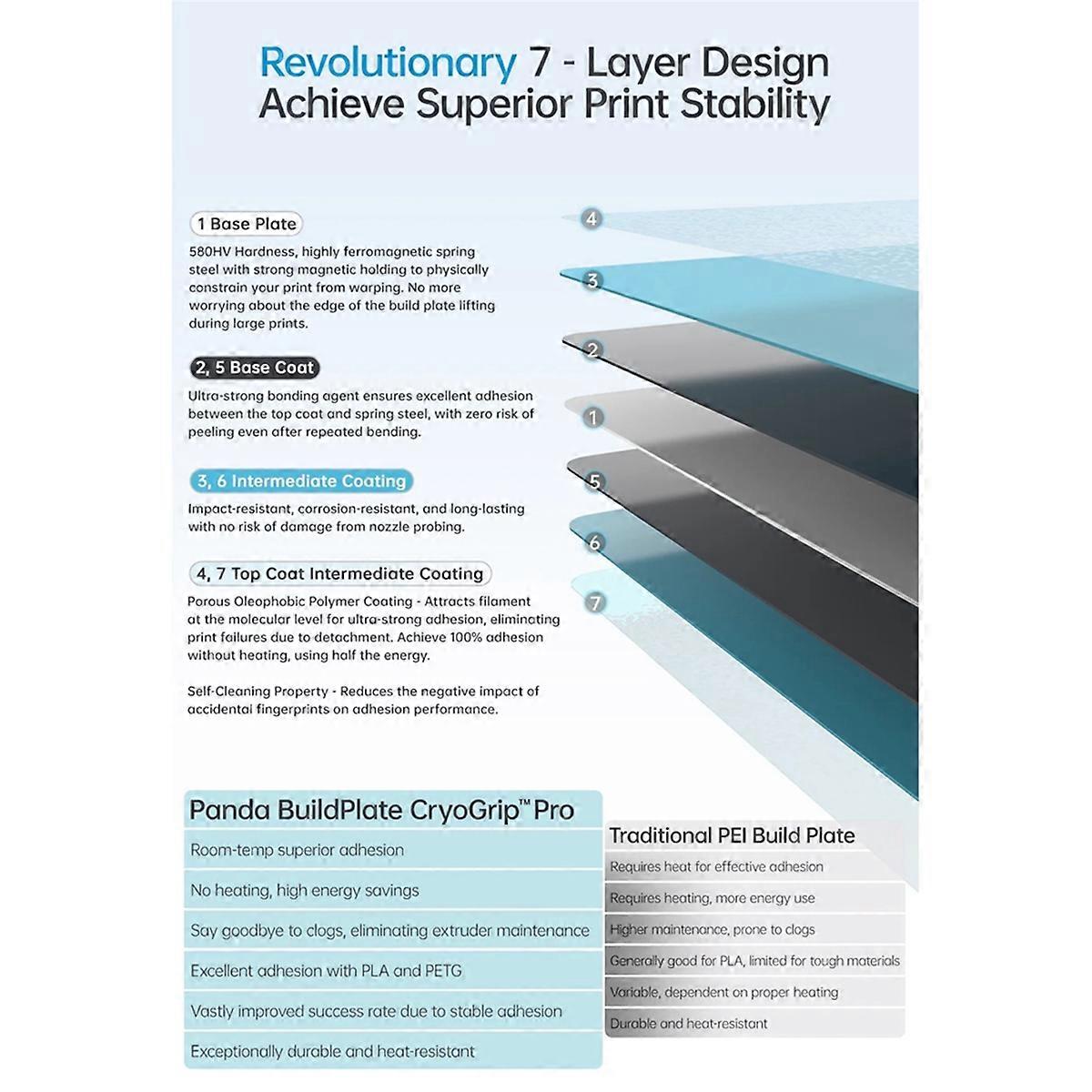 for Cryogrip Coating Breakthrough Technology: Discover the for Cryogrip Pro Buildplate- a technological breakthrough in 3D printing adhesion . Developed from a unique polymer , this build plate leads the market with unmatched stability and results , surpassing traditional PEI solutions. Unmatched Adhesion Zero Heat: Experience unparalleled first-layer adhesion with our Cryogrip Buildplate,engineered to secure your prints firmly at room temperature . Enjoy printing results with no warping. Zero Heat , Zero Clogs: Uniquely designed to print PLA at ambient temperatures , the for Cryogrip Buildplate effectively prevents clogs caused by extruder overheating. Effortless Print Removal Bend and : Simply bend the slightly , and your finished print detaches cleanly without the need for scraping or prying tools. Textured : Improve your 3D models with intricate textures. Perfect Compatibility: Compatible with for P1P , P1S , X1C , and A1 printers , the Cryogrip Buildplat eensures warp-free printing of filaments at room temperatures . This allows you to keep the auxiliary fan on and concerns about drafts affecting yourprints, even in open models like the P1P and A1. Exceptional Adhesion Roomtemp Printing Energy Saver No More Clog Double-sided Removal Intricate Texture Fully Compatible for P1P/P1S/X1C/A1 Colour:Blue Material:Spring steel + coating Package Contents: 1 x CryoGrip Pro Build Plate Only the above package content, other products are not included. Note: Light reflection and different displays may cause the color of the item in the picture a little different from the real thing. The measurement allowed error is +/- 1-3cm.