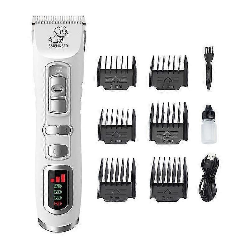Effective and Safe: professional dog clipper has a combination of ceramic blade and stainless steel blade, which ensures safety and efficiency at the same time, without scratching the animal's skin. The ceramic blade doesn't dull as quickly, giving you a smooth and long-lasting grooming experience. The blades of this dog clipper are detachable for easy cleaning. 3 Speeds and 6 Combs: 3 speed modes (6000-6800rpm/min) of this thick long hair dog clipper are adjustable, thanks to a quiet DC3 motor. 7V with sufficient power, low noise and minimal vibration. There are also 6 clamping combs (3-18mm), you can choose the appropriate speed and comb according to the breed of the animal and the thickness of the hair to ensure efficient work without scaring your dog or cat.LCD Screen - Visible Status: The smart LCD screen can display the current speed level and the remaining electricity. When the power is not enough to support the work, the low battery indicator flashes to remind you to recharge it. The dog shaver status is under your control, so you can better organize and achieve grooming. Sufficient Battery Life: This trimmer has a high-performance 2200mAh rechargeable lithium battery and can work continuously for 4 hours. This is enough to cordlessly trim the hair of all pets, regardless of their size. It can be quickly recharged in 3 hours by USB cable to car, computer or power bank. Suits Dog and Cat/ Professional and Hobbyist: Light weight and ergonomic handle design make this clipper much easier and not tiring to cut any shape of dog body with woolly hair. The low speed mode and the low noise make the clippers also suitable for fearful cats. With such a wide range of applications, this is the best dog grooming kit for professionals, also a good choice for beginners.