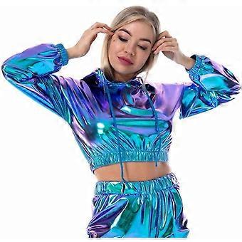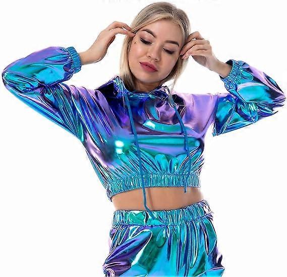Sexy Cropped Holographic Hoodies Women Shiny Pu Metallic Hoody Long Sleeve Short Sweatshirt With Drawstring Pullovers Streetwear