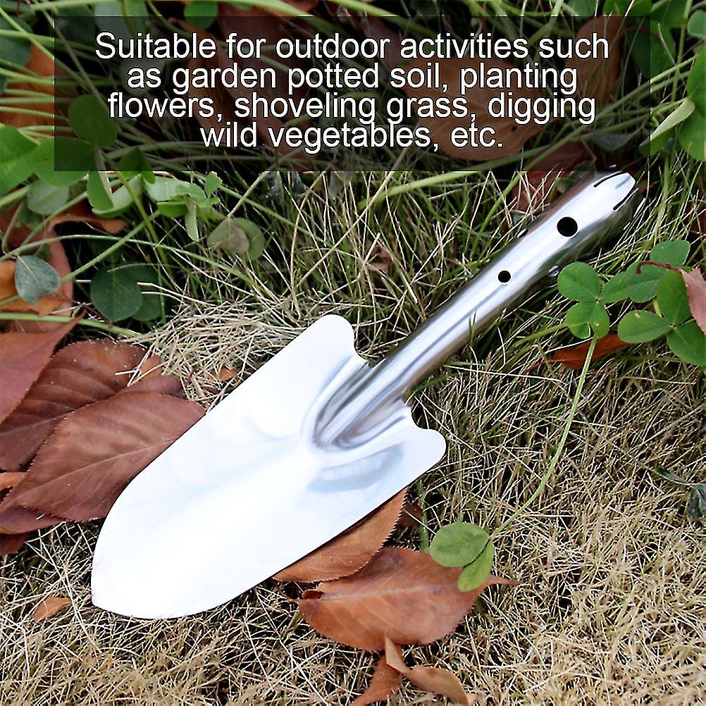 Stainless Steel Garden Trowel Potting Soil Scoop Hand Shovel Tool Soil Diggers for Gardening Planting Seedlings Material: Stainless steel Color: Silver Total length: 26.5cm, width: 6cm Handle length: 11.5cm Blade length: 15cm Weight: about 130g Scope of application: Suitable for outdoor activities such as garden potted soil, planting flowers, shoveling grass, digging wild vegetables, etc.