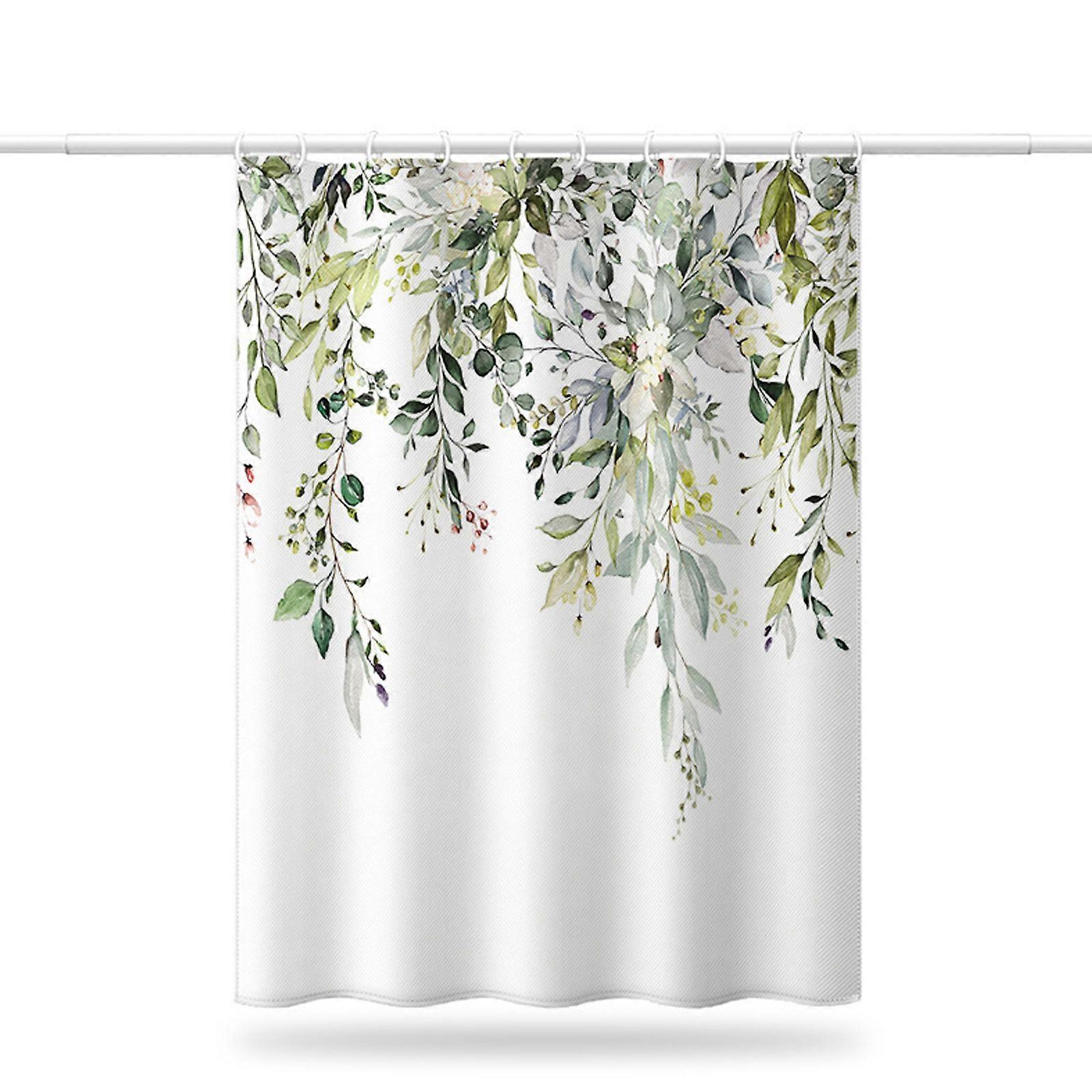Eucalyptus Shower Curtain Sets Bright Green Watercolor Leaves on The Top Plant with Floral Bathroom Decoration 71 x 71 Inch with Hooks
