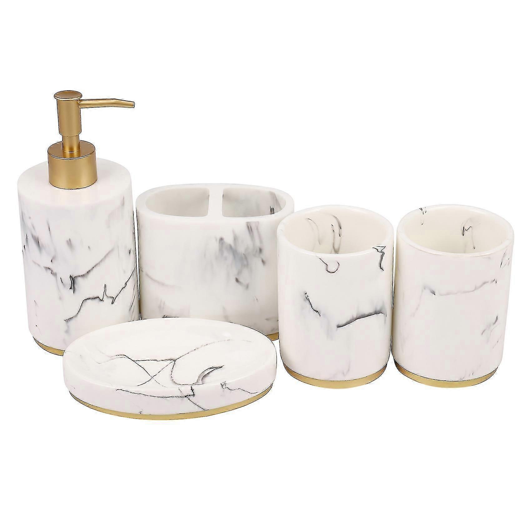 5-Piece Bathroom Accessories Set with Soap Dispenser, Toothbrush Holder & Modern Matching Pattern for Sink Countertop Decor