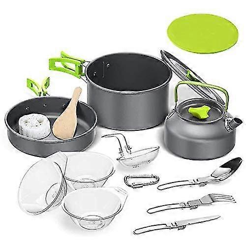Set of 14: 1 x Frying Pan, 1 x Cooking Pot, 1 x Teapot, 1 x Cleaning Sponge, 3 x Bowls, 1 x Bamboo Rice Spoon, 1 x Soup Spoon, 1 x Knife, Fork, Spoon, 1 x organizer bag, 1 x buckle, chopping board as a gift. Small and portable: The set adopts a nested structure, which saves space and is easy to carry and can be put into a backpack. The clever buckle allows the cookware to be hung around the waist, which is very convenient. Easy to Clean: Pots, pans and teapots are made of durable, lightweight aluminum oxide. Lightweight, durable, non-abrasive, non-stick, easy to clean and store. Great for Travel: Great for camping, hiking, backpacking, picnics and other outdoor activities, great for family and friends. Safe to use: Insulated plastic handle to prevent hand heat, non-slip design, FDA certification, safe and healthy use.