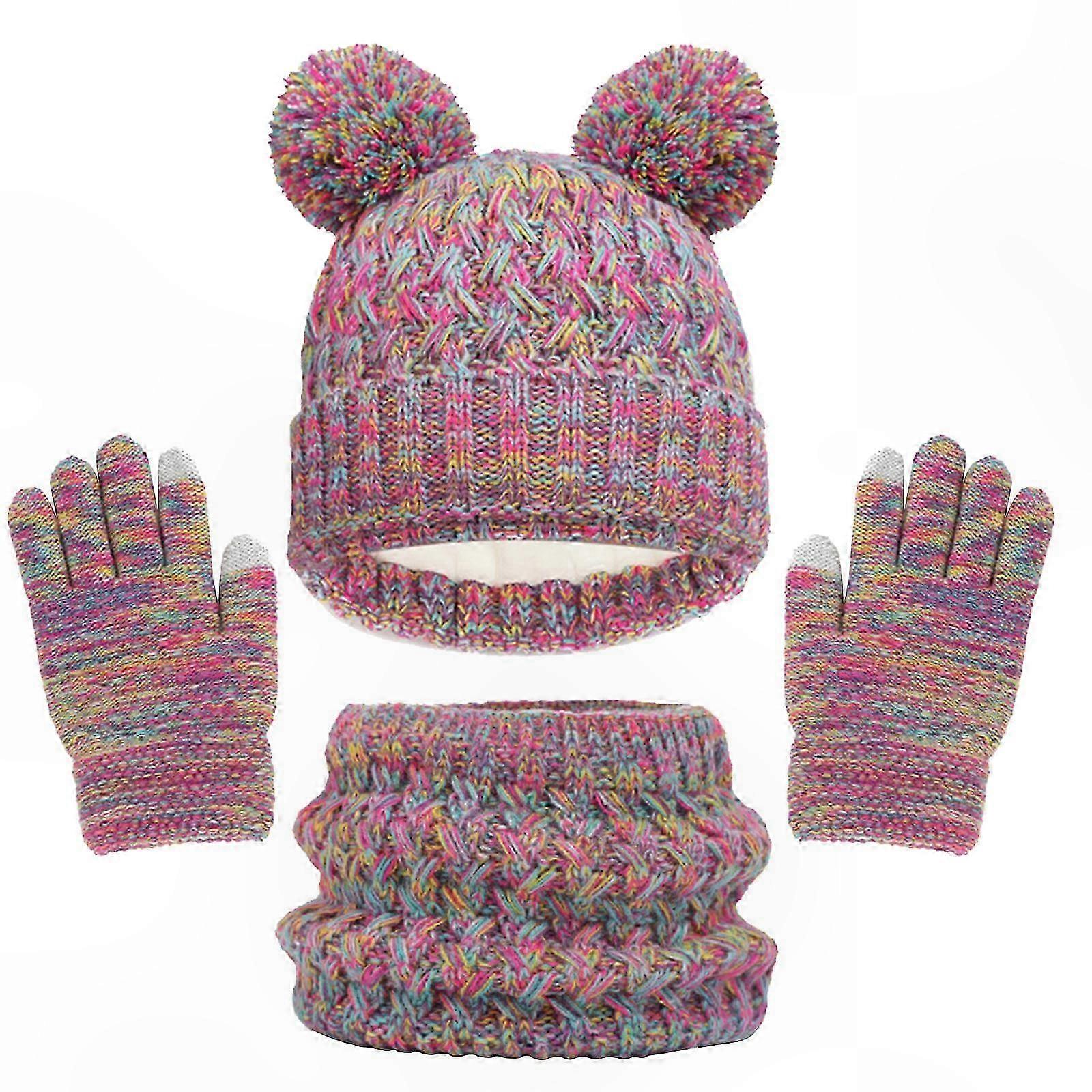 Purple Winter Hat Scarf Gloves Set for Kids - Warm Knit Beanie with Pom Pom for Boys and Girls