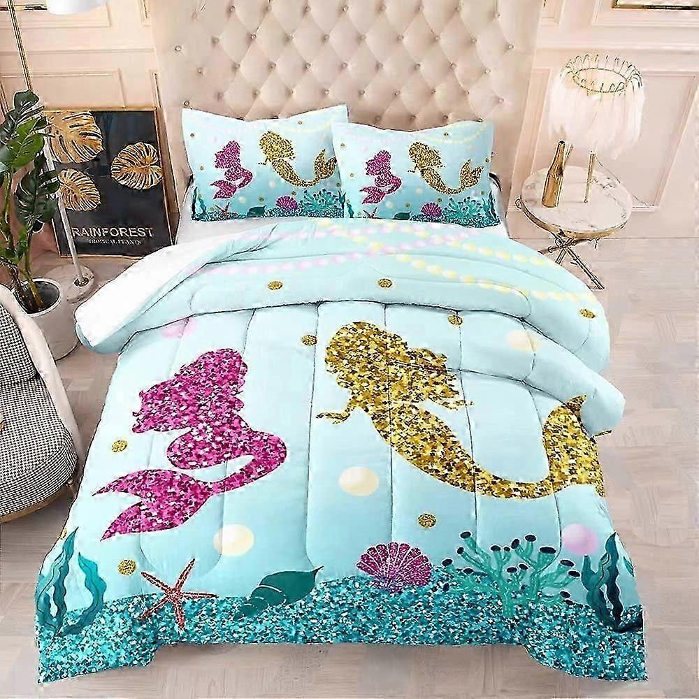 Kids Mermaid Comforter Set Twin, 3D Glitter Mermaid Princess Under The Sea Pattern Ultra Soft and Breathable Microfiber Fill Warmth Down Quilt Sets