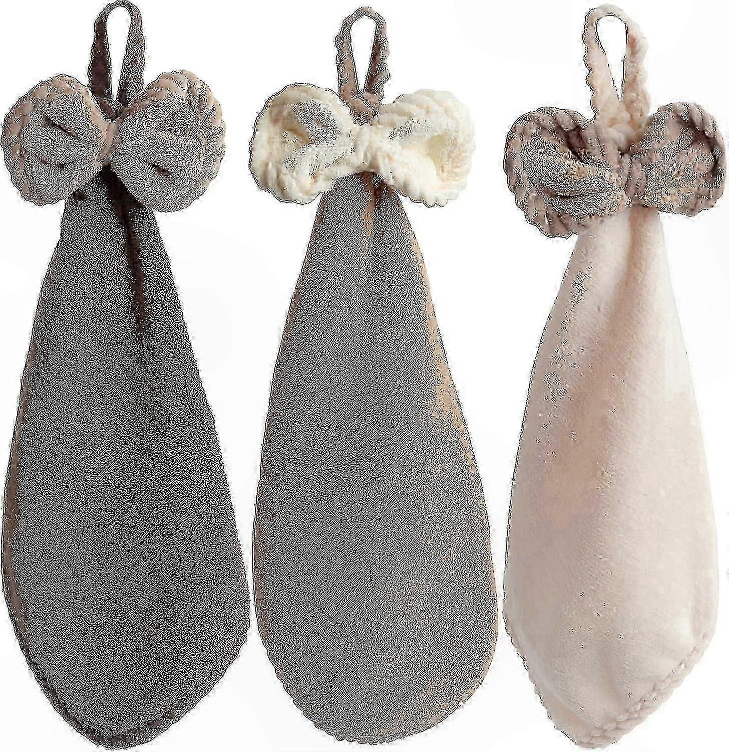 About this item Safe and high quality material: Premium coral fleece fabric ensures the hand towel is safe to touch, fast drying, soft and comfortable. Super absorbent for quick hand drying Attractive design: The hand towels feature vibrant colors and cute bows, making them appealing to children and encouraging regular handwashing Hanging loop design: Each towel includes a hanging loop for easy storage in the kitchen, bathroom, or toilet. Space-saving and allows for quick drainage Durable: These towels are soft, long-lasting, easy to wash, colorfast, non-fading, reusable, and economical Multipurpose: Suitable for drying hands, washing dishes, wiping tables, and cleaning furniture. Ideal for home use. Size: 280x3x280mm. Pack of three colors: Beige, khaki, brown