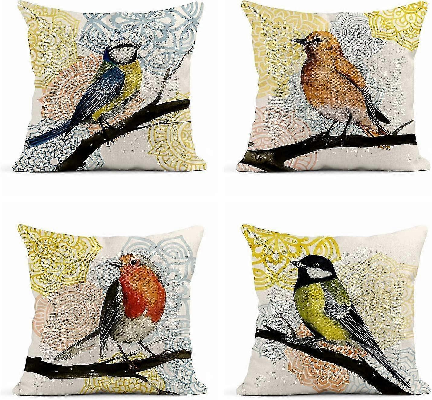 4-Piece Set of 18x18 Inch Linen Throw Pillow Covers with Colorful Mandala Bird Design for Sofa, Bed & Couch Decor