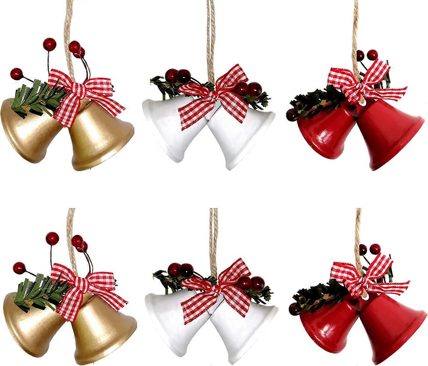 Set of 6 Christmas Tree Hanging Christmas Bells with Bow and Red Berries