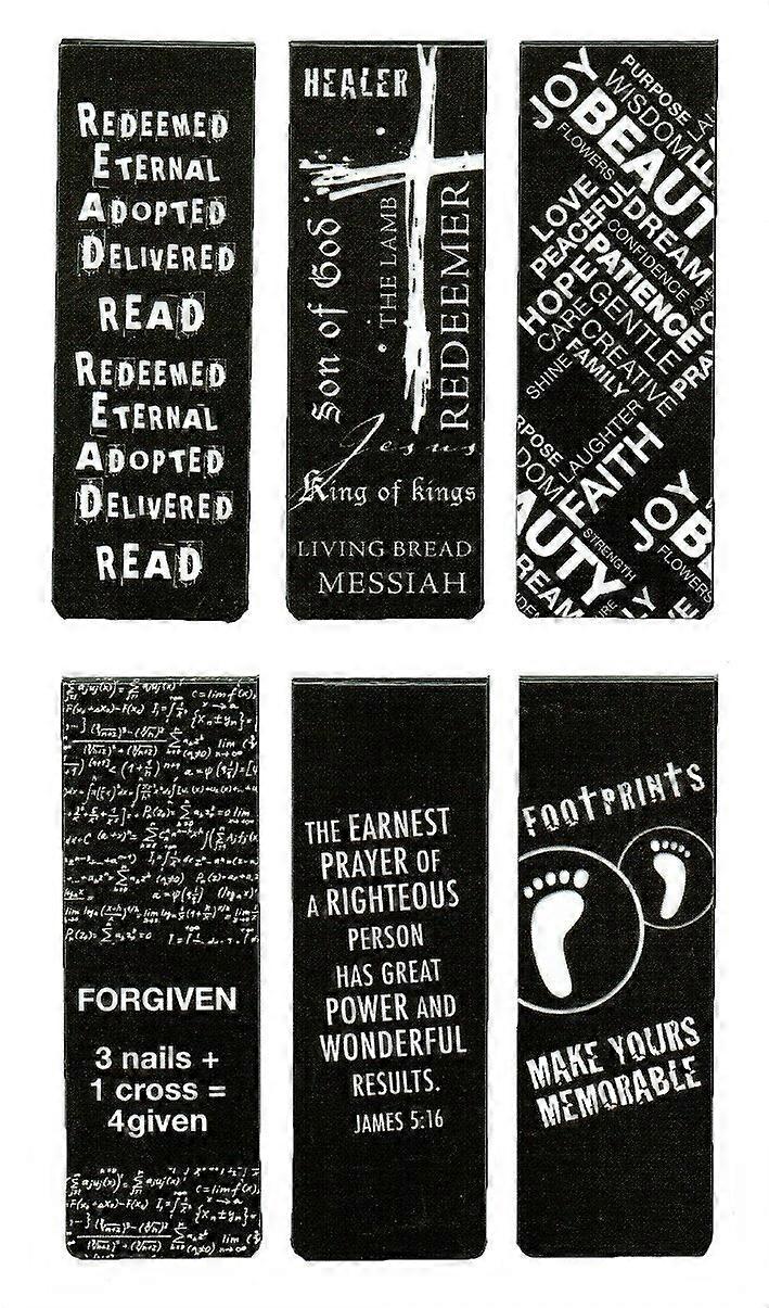 CHRISTIAN BOOKMARKS: Delight, encourage and inspire with these handy Christian book accessories. Each cute magnet bookmark has a unique design incorporating Scripture and inspirational encouragements.MAGNETS STAY IN PLACE: Keep your place secure with these magnetic bookmarks designed to fold over the page of your Bible, Bible Study book or favorite novel. These six bookmarks are sure to become your favorite way to keep your place. These little magnets are sturdy and will not fall off the page.PERFECT SIZE: Each magnet is approximately 2.25 Inches by .75 Inches when folded over a page making them easy to place and find.PRESERVE YOUR BOOKS: Place one of these useful bookmarks on your books and say goodbye to worn and creased pages.CHRISTIAN GIFTS: Christian Art Gifts offer a wide variety of personalized Scripture print items. From Bible Covers, Coloring Books, Journaling Bibles, Journals, Planner and Devotional Books, the company strives to bring the best quality products with a special message on each one.Size:1 PACK: Size Small (.75" x 2.25") | Color:Black and White A great giftfor your son, nephew or husband, the Black And White Magnetic Bookmarks areideal for him to mark his page, whether hes studying for an exam, reading theBible or starting a new fiction novel. The boldness of the sentiments in whiteon the black background will grab his attention to remember who Christ is, howhe is delivered from sin and how he can practice and preach these truths withhis family and friends, along with new people he meets, further sharing theGood News that Christ is risen. The Black And White Christian MagneticBookmarks come in a set of 3 packs with 6 bookmarks in each. Empowering wordsare featured, such as Redeemed, Delivered, Forgiven, Prayer,Footprints, Patience and more on the front and back of the inspiringbookmarks.