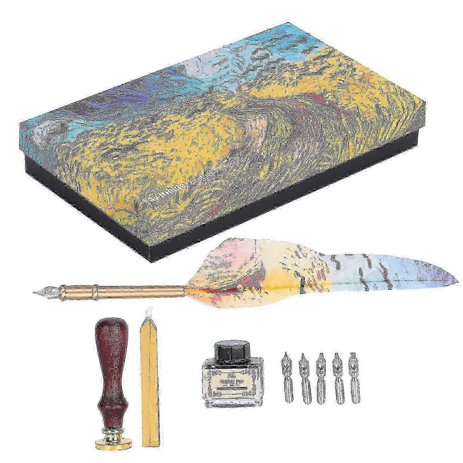 Feather Pen Dip Art Calligraphy Retro Vintage Quill Gift Box Kit with Lacquer Stamp ToolWheat Field