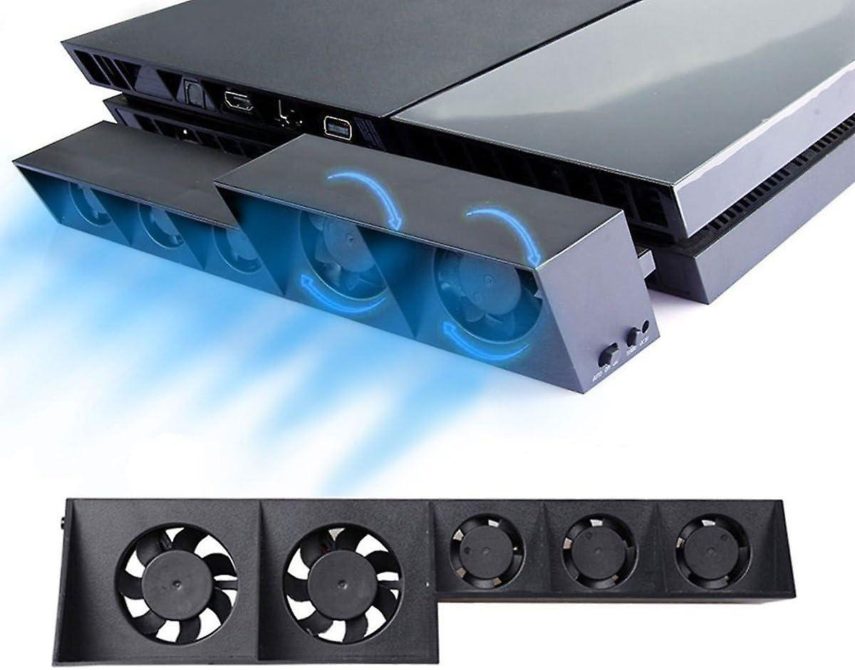 [PS4 Fan] - The external turbo cooler has 5 mini fans that extract heat from the Sony PS4 case to keep the working temperature and keep the game console cool when playing games with heavy load in the hot summer. Compatible with the first edition of PlayStation 4. Doesn't fit PS4 Pro and PS4 Slim first [Automatic and Manual] - Two working modes and a turbo mode button to set the working modes. The fans turn on when it gets above 38 degrees Celsius and turn off when it cools. The cooler regulates the working temperature automatically with the built-in sensor [Snap-on Easy Installation] - Quiet and slim design, tight fit with PS4. Easy, tool-free clip-on installation. Works with most PlayStation vertical chargers on the market. The PS4 USB port is supplied with 5 V DC power. No additional power supply required [Compatibility Notice] - Compatible with the first PlayStation 4 CUH-1xxx. It does not fit either the PS4 Pro CUH-7xxx series or the PS4 Slim CUH-2xxx Automatic Control at Turning Point 38 ℃ Exclusively Designed for first PS4 Console Balanced Airflow Volume and Noise Level Easy tool-free snap-on installation Working Voltage: USB DC 5V Working Current: Max at 600mA Working Mode: Manual and Auto Small fans: 3x DC5V 0.12A Big fans: 2x DC5V 0.15A Dimension: 53x74x222mm Import Notes: 1Compatible with first PlayStation 4 CUH-1xxx ONLY. Not fit PS4 Pro CUH-7xxx, nor does PS4 Slim CUH-2xxx 2.Please fasten it tight onto the back of the console, or abnormal noise will produce