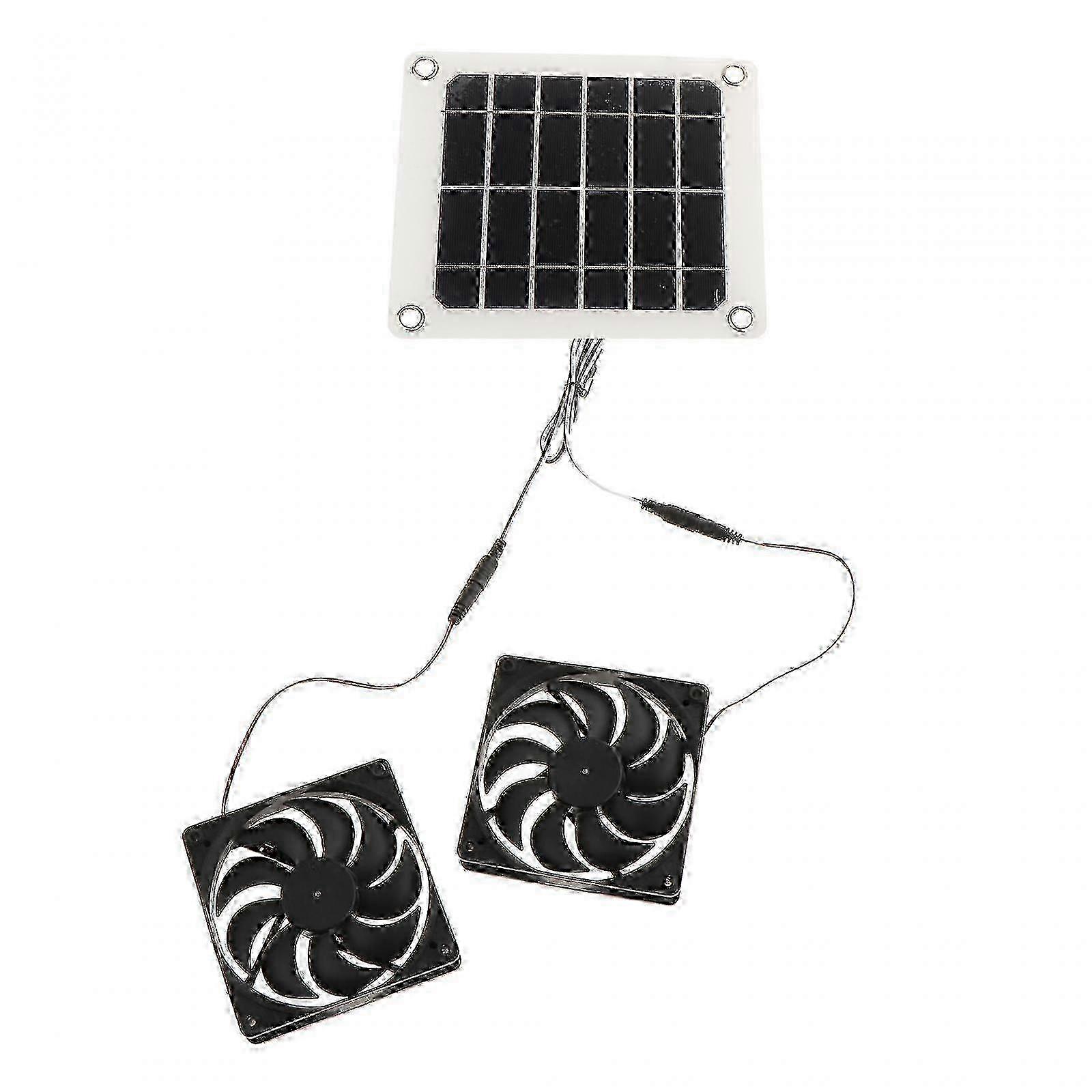 [Product list]: 1 solar board, 2 exhaust fans, panel size is about 220mmx190mm, exhaust fan size is about 120mmx120mmx25mm. [Material]: Solar Fan Kit is made of quality monocrystalline silicon, epoxy resin surface laminated, IP65 waterproof, improving durability. long lasting. 2 fan exhaust is more efficient. [Easy to install]: The fan connection cable of Solar Fan is extended by 1 meter, making it easier to customize the installation and improve the heat dissipation efficiency. Outdoor solar panels can efficiently convert sunlight into electricity. [Function]: Solar Board Powered Exhaust Fan can keep the air clean and help eliminate odors from pets, etc. Bringing you a fresher experience. [Scope of application]: Solar Exhaust Fan is suitable for greenhouses, pet houses, tree houses, RVs, etc. to maintain a comfortable temperature level. Specification: Material: Monocrystalline Silicon Power: 10W Voltages: 5.6V Number Of Cells: 18 Open Circuit Voltages: 18 Short Circuit Current: 2 Maximum Power Point Operating Current: 5 Size Chart: Panel Size: About 220mmx190mm or 8.66inchx7.48inchx Exhaust Fan Size: About 120mmx120mmx25mm or 4.72inchx4.72inchx0.98inch Package Includes: 1  Solar Power Panel 2  Exhaust Fans