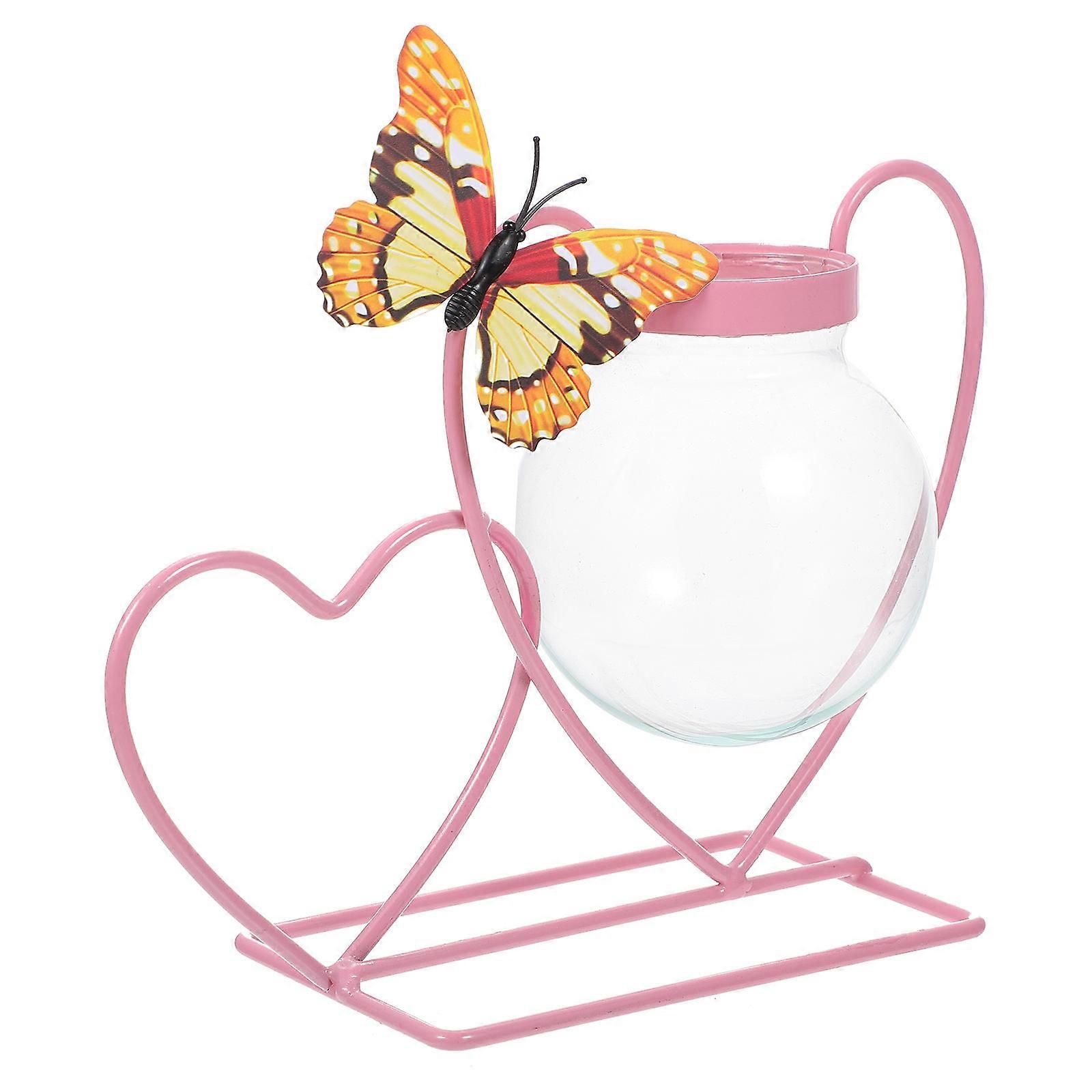 Pink Glass Hydroponic Vase with Metal Heart Rack for Storage and Decorations