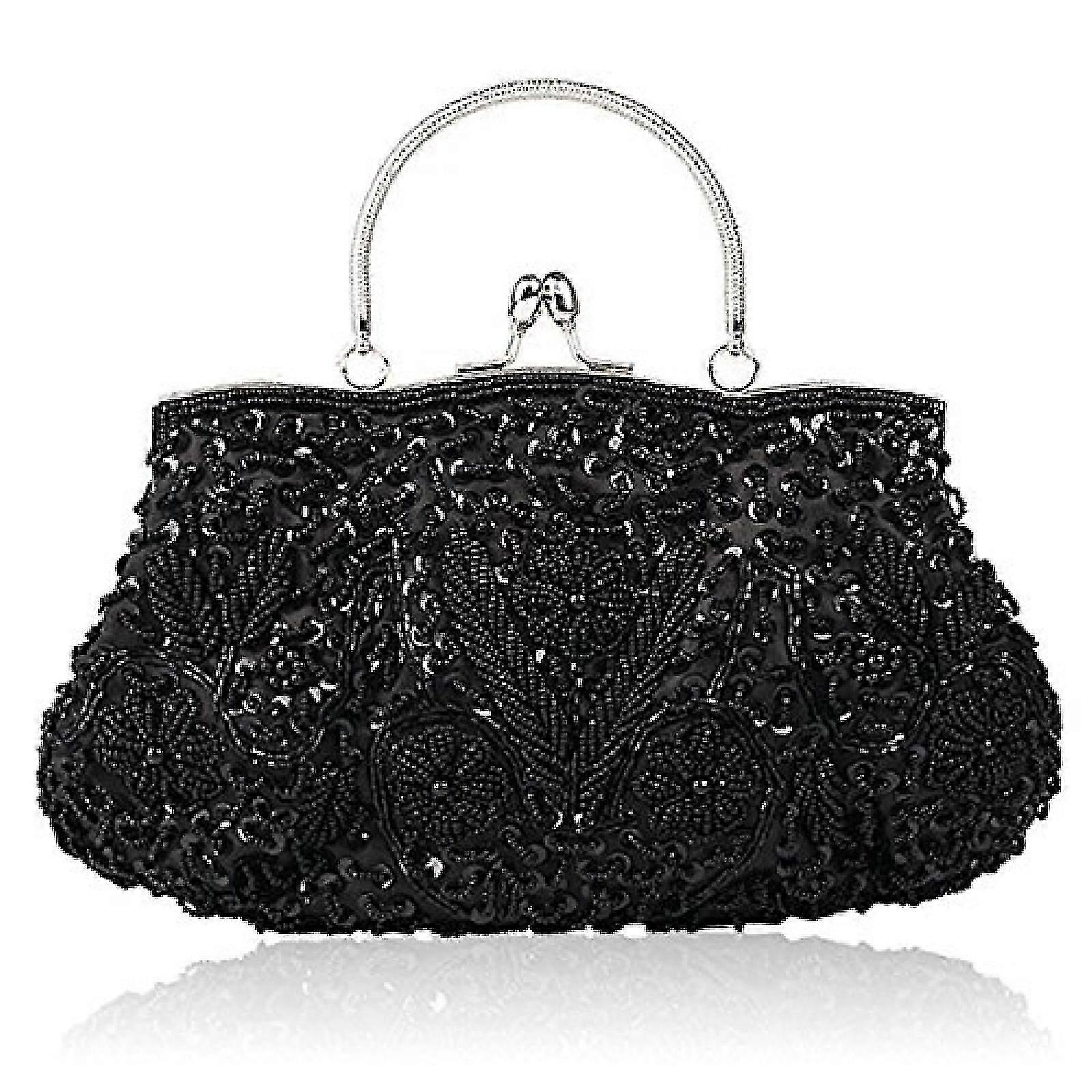 Beaded Sequin Design Flower Evening Purse Large Clutch Bag, Black