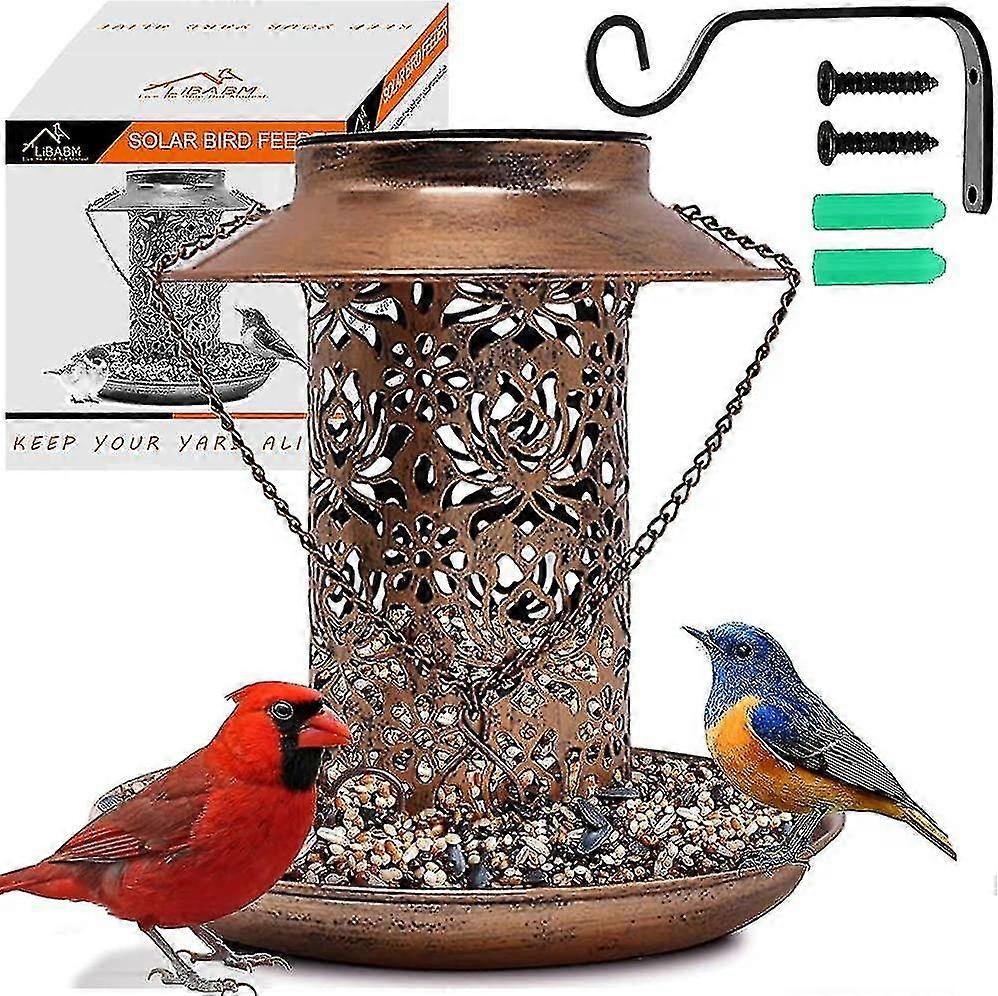 BIRD FEEDER SOLAR LIGHT LANTERN 2 IN 1 - wild bird feeder designed as unique flower pattern lantern shape, solar powered with rechargeable battery, and equipped with a bright warm white LED, the waterproof solar light automatically sense the dusk and light up, it is a good idea decor for your house outside clearance, like patio, backyard, front porch, balcony, deck, lawn, gazebo. It is a decorative gift especially in Christmas, Diwali.METAL BIRD FEEDER - finch feeder is totally made of metal and it is rust resistant, sturdy enough for outdoor inclement weather conditions and resist from small animals damage, like squirrel, mouse. and the retro colors makes your courtyard has lasting appeal more.COMPLETE HANGING BIRD FEEDERS SET - For your convenience, solar bird feeder attached with bird feeder hanger and related accessories, plus the metal hanging chain itself with a hook, you can hang it in any outdoor place without worry, such as shepherds pole, tree, wall, fence, railing, eave and near your bird house outside. Of course, its flat tray design allows it stand on a flat surface, like standing station, lawn, ground, platform, floor.LARGE CAPACITY & EASY FILLING AND CLEAN - The bird seed container allow fill up to 2.5lbs of bird seeds, like mealworm, sunflower, safflower, peanut, corn all are suitable. it is easy to fill bird seed and easy to clean thanks to the feeder top can be totally opened, the circle tray edge allow more bird to stand on, so enjoy more cardinal, finch, bluebird, and other songbird around with you.AFTER-SALES SERVICE - We have been committed to providing customers with the best quality products and services, If for any reason youre not 100% SATISFIED, please let us know and our customer service team will help you RETURN OR REFUND.