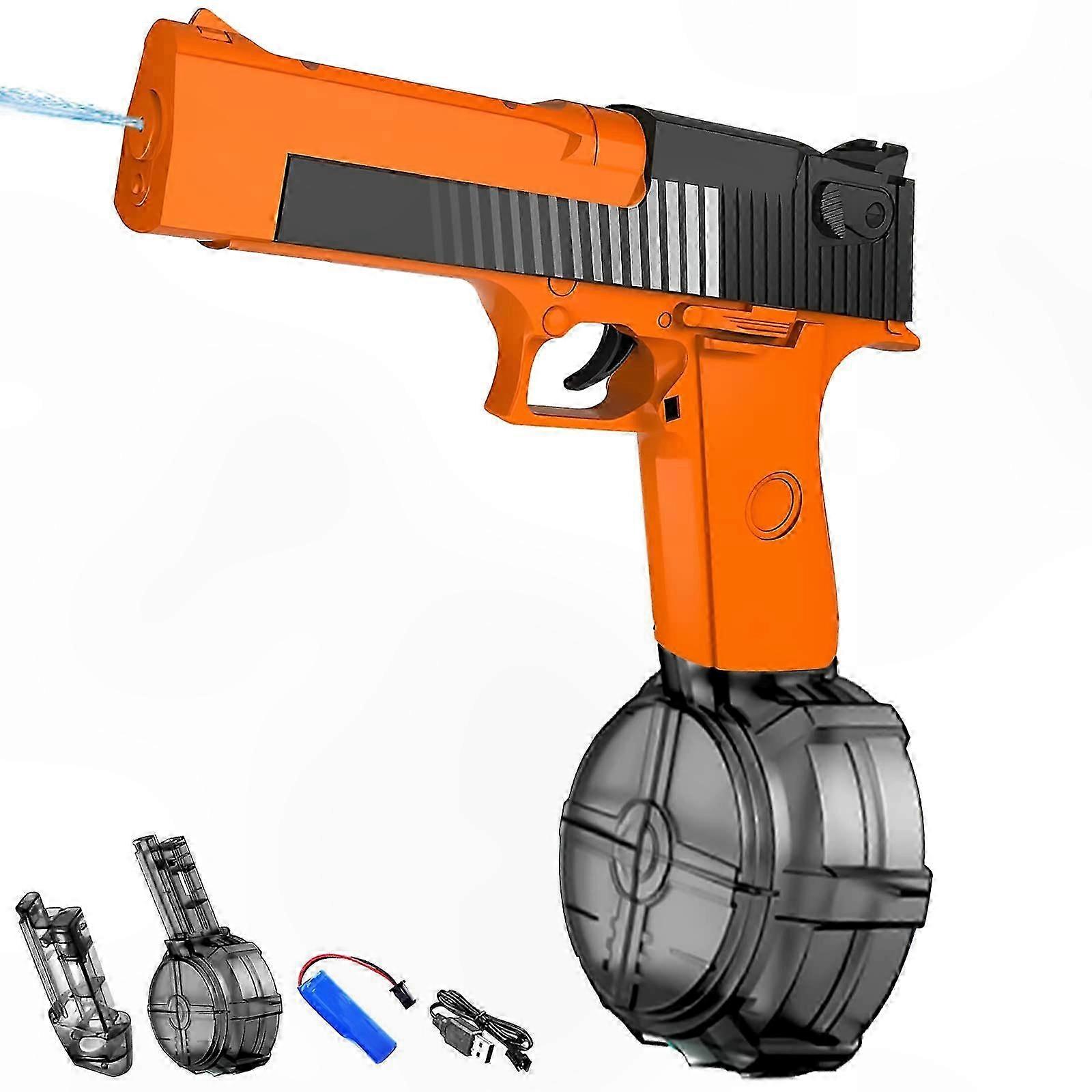 Features 1. Automatic water gun: The water gun handle is made of durable and safe materials with a non-slip design for easy use by adults. Each trigger pull releases a powerful jet of water—simply press the trigger to shoot. 2. Ideal water toy: Compact design with large water capacity, making it a great water blaster for kids and adults. 3. The battery compartment features double waterproof rubber seals to prevent water ingress. Long battery life enables extended playtime. Perfect for outdoor use in gardens, pools, beaches, and summer parties to stay cool in hot weather. 4. This automatic water gun is ideal for water battles with friends. Quickly swap in a replacement water tank for fast reloading and continuous action. Aim and shoot from any distance. 5. The water spray gun has a unique and cool appearance that appeals to children. Specification Material: ABS Color: Green, Orange Size: 22 x 10 x 26 cm, 22 x 5 x 17 cm Weight: 420 g, 360 g Package Include: 1 x Electric Water Gun