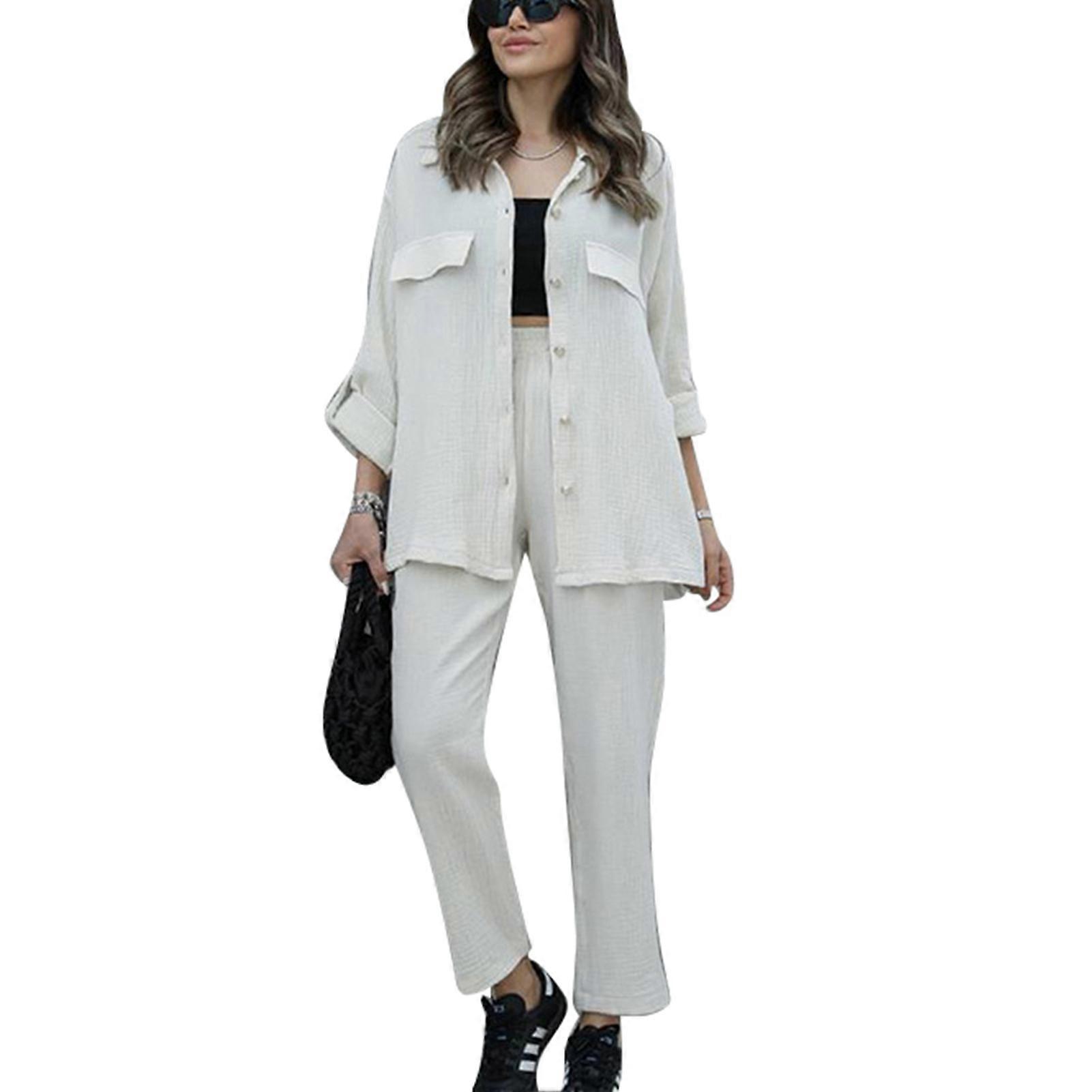 Women Two Piece Outfits Turn Down Collar Long Sleeves Top Elastic Waist Pants Casual Set White L