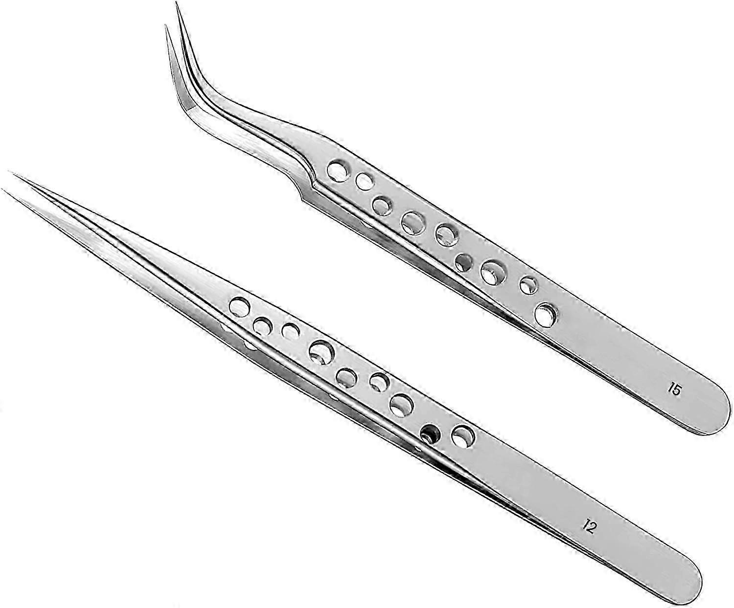 Eyelash Extension Tweezers Stainless Steel Straight and Curved Volume Lash Tweezers Set of 2 for Professional Eyelash Extension Application -9 Holes