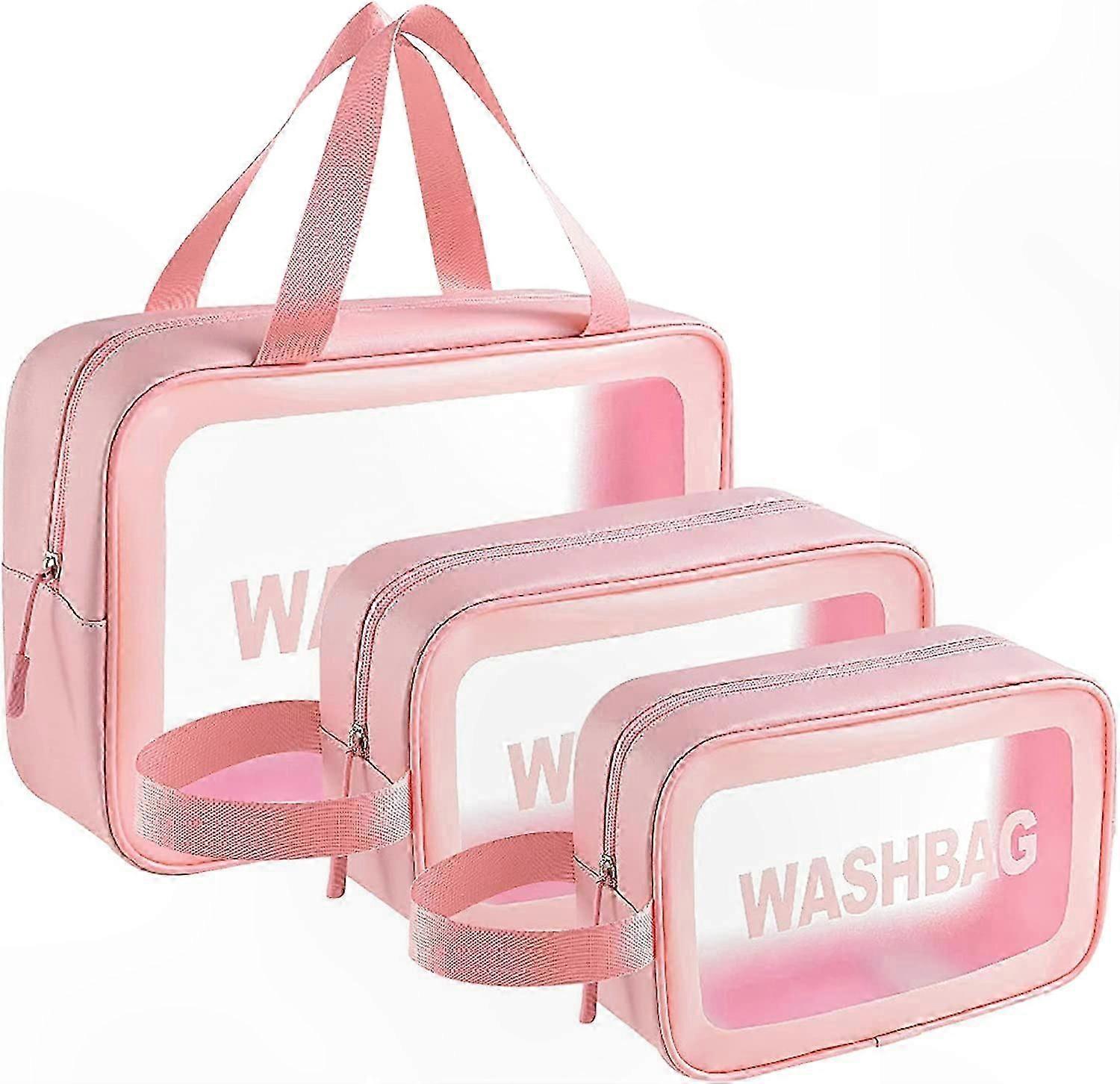 Perfect 3 Sizes: You will receive 3 pink makeup bags in different sizes. Large: 11.6*7.8*4.1 inch; Medium: 9.6*5.7*3.7 inch; Small: 8*5.1*2.7 inch. Meet your needs for organizing various items. High Quality Material: Our clear toiletry bag is made of high-quality PVC material, durable, environmentally friendly, and odor-free. It offers high wear resistance and is easy to clean, ensuring long-term use. Comfortable Handle: This clear wash bag features a strong strap, allowing it to be hung on a towel rack, coat hook, or other convenient location. Keeps your toiletries and cosmetics neatly displayed and easily accessible while saving counter space. Waterproof & Reusable: The travel toiletry bag is made of high-quality waterproof PVC fabric, providing waterproof protection both inside and outside. It is easy to wipe clean and reusable, offering reliable protection against leaks or spills. Multi-function: This cosmetic organizer is ideal for bathroom storage, business trips, vacation travel, gym use, and outdoor activities such as camping or picnics. A great choice for women's and girls' gift giving on various occasions.