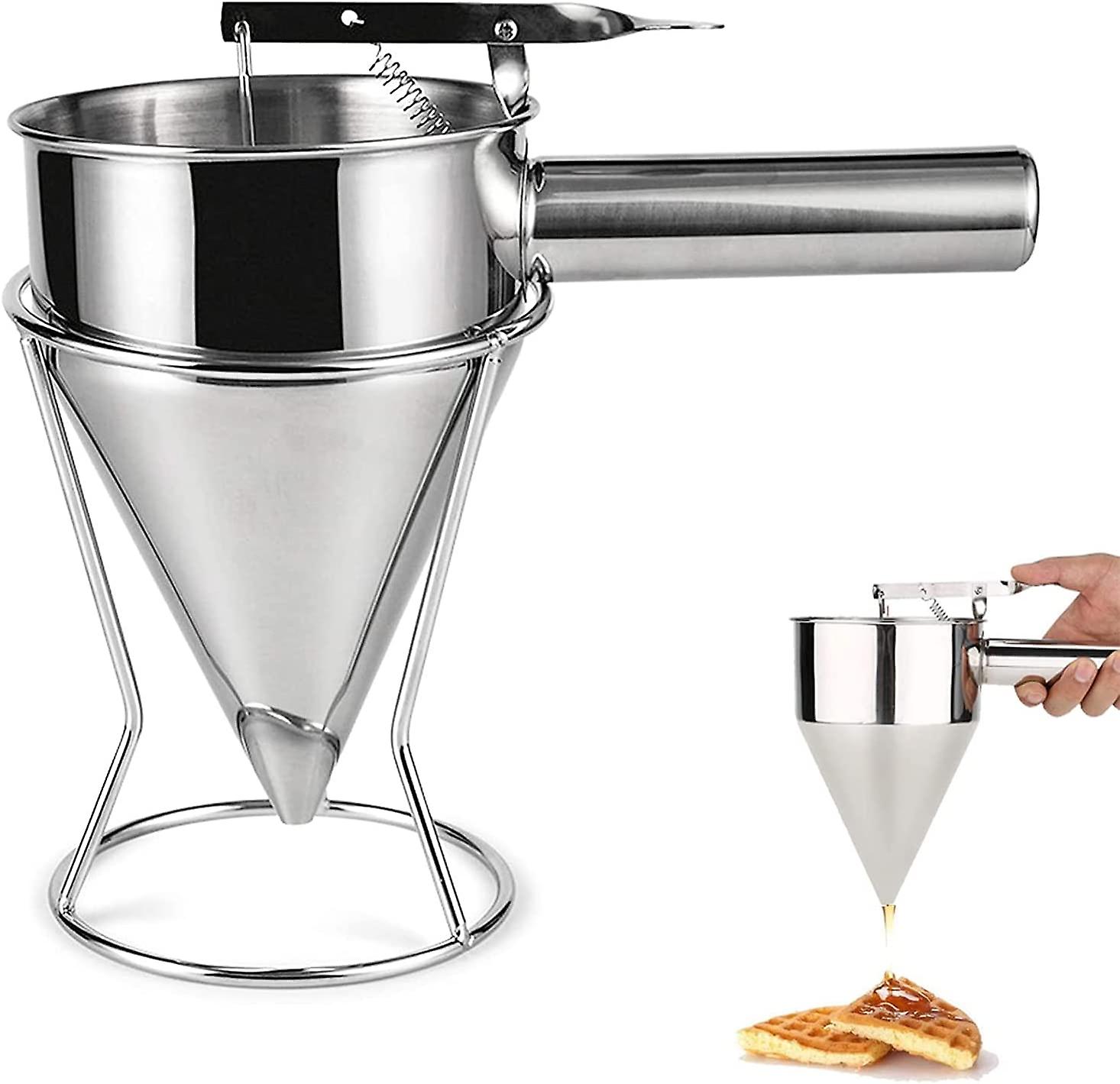 21oz Stainless Steel Pancake Batter Dispenser - 304 Food Grade Funnels with Handle & Stand Rack - Perfect for Takoyaki, Pancakes, Cupcakes or Other Ba