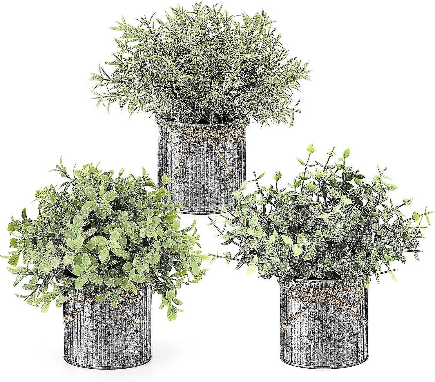 Mini Fake Plants In Farmhouse Galvanized Metal Pots Table Centerpiece Rustic Home Decor, 3 Pack Lightweight Potted Artificial Plants Faux Eucalyptus F