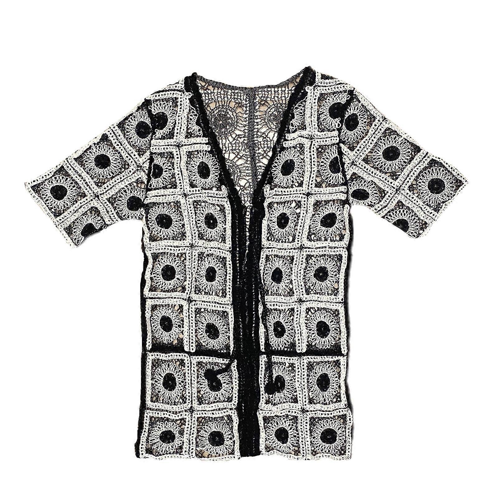 Women Boho Open Front Crochet Cardigan Half Sleeve Loose Hollow Knit Contrast Color Floral Holiday Sweaters Coat Coverup D