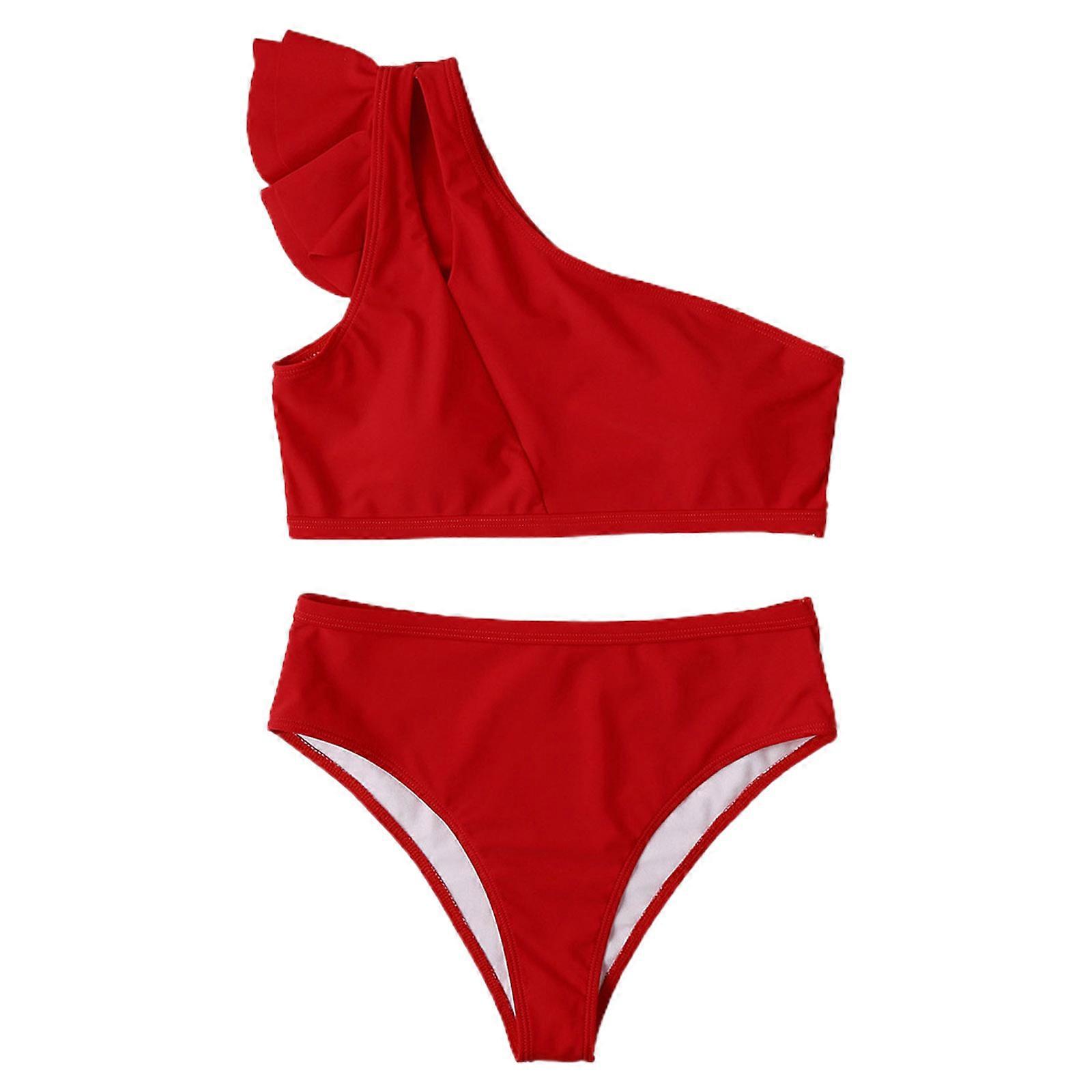 Women Sexy Swimwear Solid Color Backless Bikinis Set One Shoulder Swimsuit Wide Strap Comfortable Ruffle Fashion Bikinis Red S
