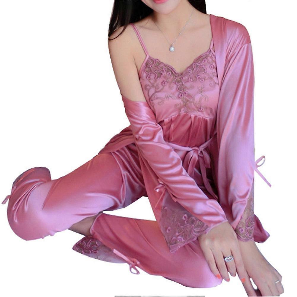 Women Three-piece Floral Lace Coat Sling Top Pants Homewear Pajama Sleepwear Set(Cameo Brown)