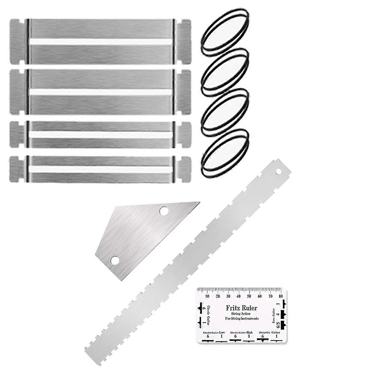 HIGH QUALITY: This tool set includes a wire rocker leveler and notched straight edge, both made of high-quality 6061 aluminum. Guitar Neck Straightness Check Tool: Designed with two sides of the neck to work with most electric or acoustic guitars, this is an Perfect tool set to your guitar soundboard is straight. FRET Rocker: Suitable for electric guitar, acoustic guitar, , mandolin, banjo, folk guitar, electric guitar, etc. Dimensions and weight: Wire rocker: 100 x 50 x 2mm; Weight: 50g. Neck straight edge: 16.5inch x 1.5inch x 0.08inch (420mm x 37mm x 2mm); CONVENIENT DESIGN: Grooves on one edge of the fretboard guards are a , and rubber bands hold the guards in place to they don't fall off during use; they're convenient, simple to use, and can be freed Use your hands to complete the task at hand. PROTECT YOUR GUITAR: This fretboard protective set is an excellent tool for luthiers, guitarists, and do-it-yourself musicians; the case protects your guitar or fretboard from scratches or damage during filing and polishing processes and Resilient Material: Made of high-quality stainless steel, these fretboard protectors are not prone to rust and deformation; they you for a long time and provide a good and smooth usage experience, making them a must-have for any guitar maintenance tool kit components Colour:Photo Color Material:Stainless steel Package Contents: 1 set of guitar fretboard guards Only the above package content, other products are not included. Note: Light reflection and different displays may cause the color of the item in the picture a little different from the real thing. The measurement allowed error is +/- 1-3cm.