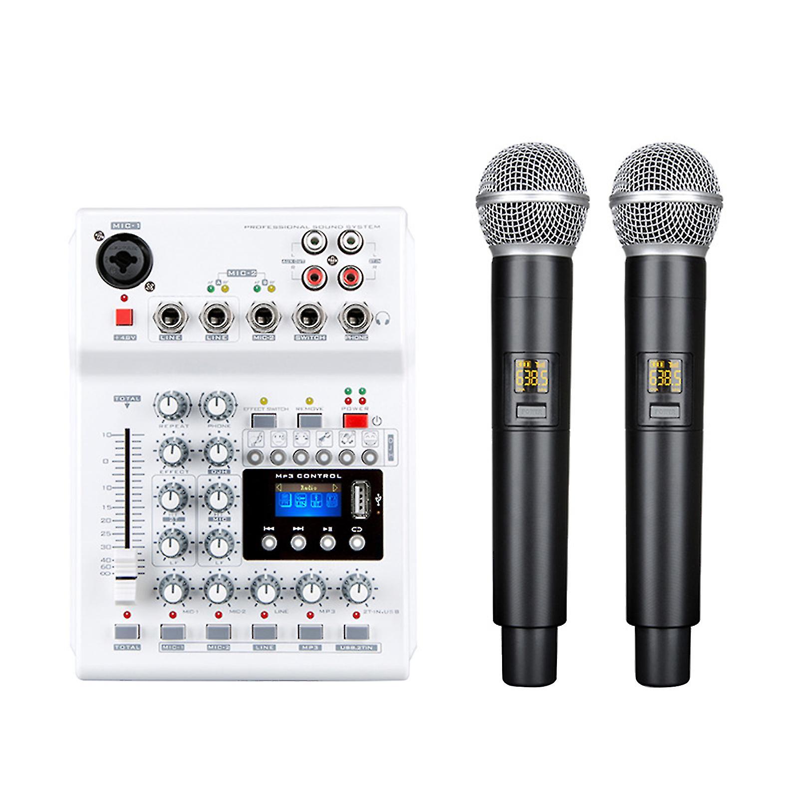 Description:It is suitable for professional recording condenser microphone due to its built-in 48V phantom power supply.With built-in universal drive, it can be installed automatically and is convenient to use.It is made of metal shell, which is solid and durable. It has gold-plated XLR, sealed potentiometer and switch, high-quality two band equalizer, channel and main mixing level display. It can connect to your external USB, PC computer, flash drive or Bluetooth-compatible device for mixing and recording, use built-in controls to play/pause, skip tracks and switch between modes.The length of the console mixer is 18cm, the width is 14cm and the height is 4cm. The length of the microphone is 24.3cm, the width is 5.5cm and the height is 5.5cm. It adopts LCD digital display, has built-in six kinds of effect sound effects, and has two-way (L/R) recording output, one transmission output, one return input, one auxiliary input, one group of stereo mixing output, each function listening switching, and one high fidelity and high-power headphone output (1W).It is very suitable for recording and music production that needs to mix multiple channels. It is very suitable for your drum, keyboard and small stage settings. It can wirelessly connect music tunes from for iPad, for iPhone and for Android smartphones, and mixing boards from for Pandora or for Spotify. With 2 UHF frequency handheld microphones, it has integrated functions and is more convenient to use.Item Name: Console MixerMaterial: MetalInput Channel: Mono(Microphone/LINE), USBIN3, AUXIN Input Sensitivity: MIC: 60dB, LINE: 20dB, EffRet:20dB, TapeIn: 20dBDSP Effect: 24Bit/48KSampleSNR: >105dBDistortion (THD): 0.01 Percent (1KHz Full Power)Frequency Response: 18Hz-18KHz3dBOutput Voltage: 5V Max. (Plug Not Included)Power Supply: AC90-220V/50HZ, Can Be Directly Powered by Computer, USB Plug and Power BankFeatures: Live Sound, LCD Digital Display, Wireless ConnectionSize Details: Console Mixer Size: 18cm x 14cm x 4cm/7.09" x 5.51" x 1.57" (Approx.)Microphone Size: 24.3cm x 5.5cm x 5.5cm/9.57" x 2.17" x 2.17" (Approx.)Notes:Due to the light and screen setting difference, the item's color may be slightly different from the pictures.Please allow slight dimension difference due to different manual measurement.Note that the microphone needs to be equipped with 2 x 1.5V AA battery (not included, need to be purchased separately).Package Includes:1 x Console Mixer2 x Handheld Microphones1 x 6.5 to 3.5 Plug1 x USB Cable