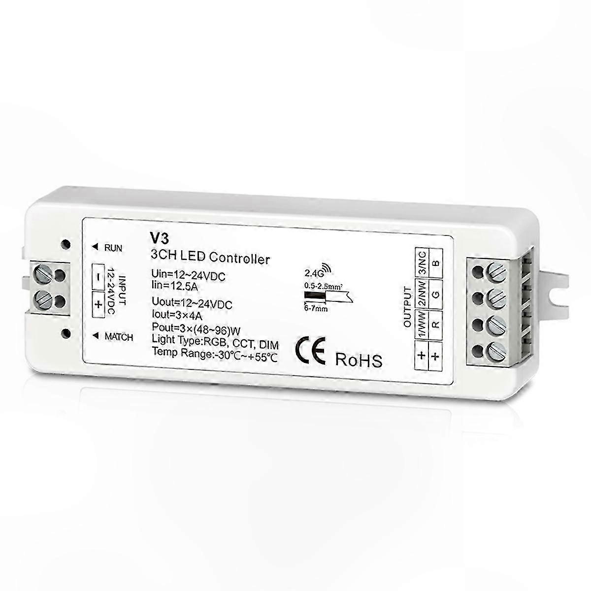 3-Channel LED Controller V3, 2.4G Remote, 12-24V DC, Stepless Dimming, CCT Control for LED Strips