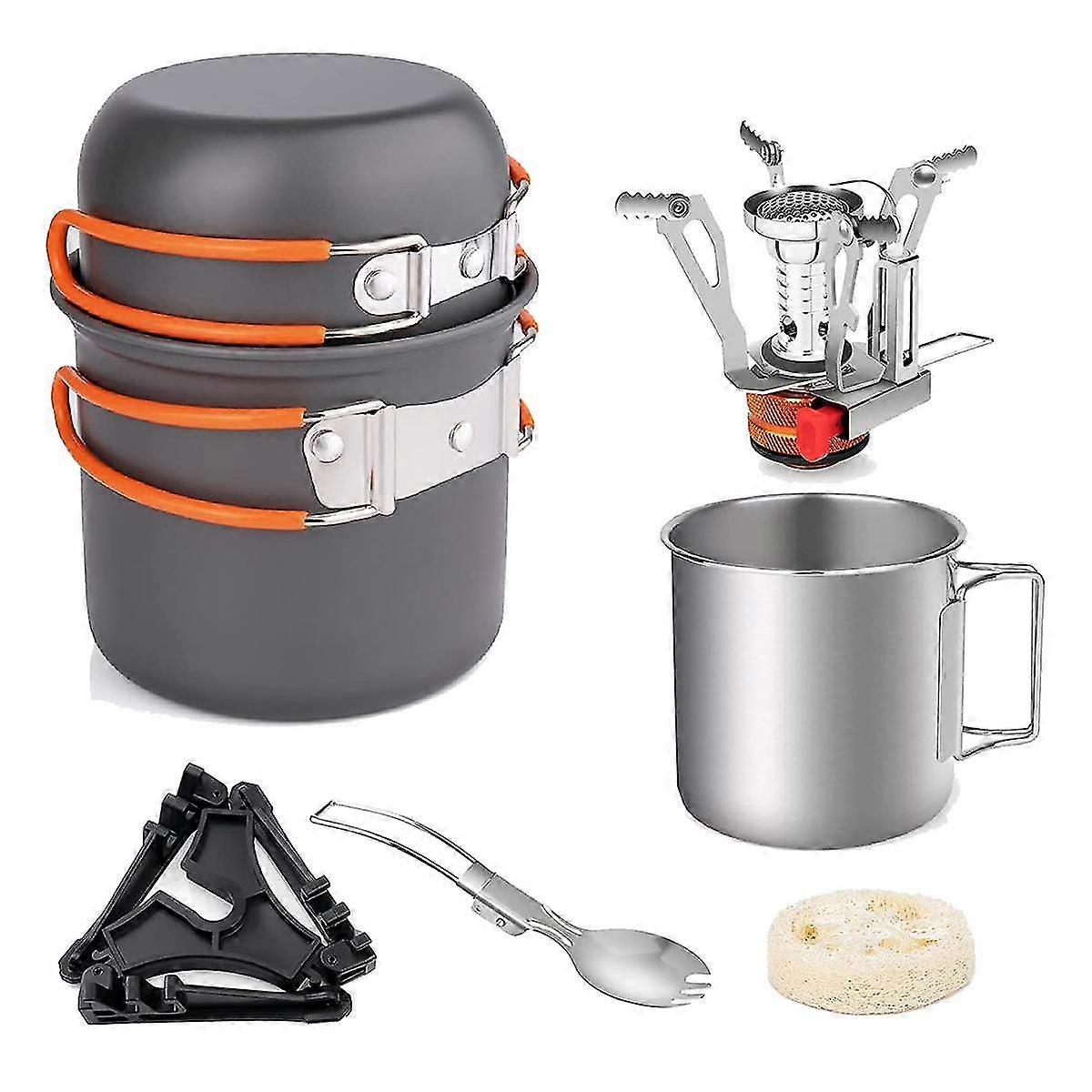 Camping Pot And Pan Set With Mini Backpacking Stove Cooking Gear For Outdoor Hiking Campfire Orange
