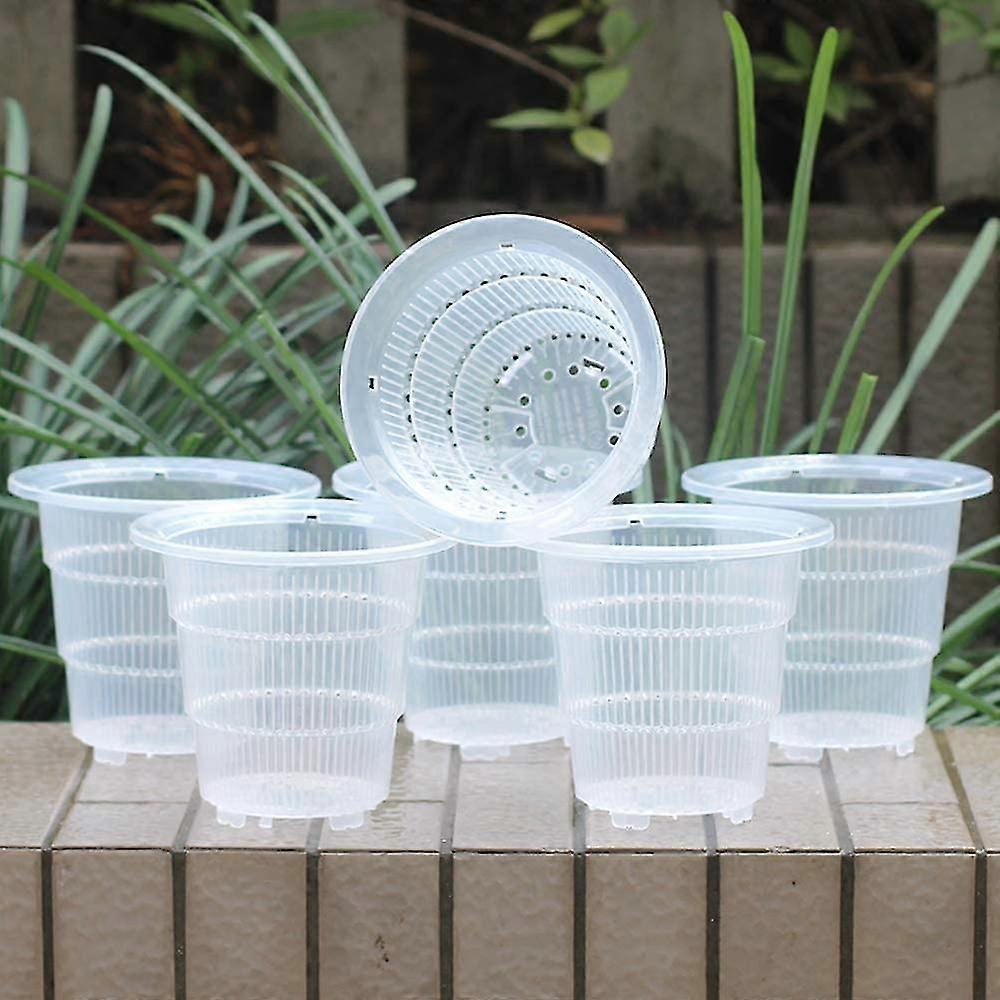 Material -- Food grade PP, sturdy and lasts 10 years outdoors. This plant pot is specially designed for orchids -- such as OrchidDendrobium, Clivia miniata, Phalaenopsis aphrodite Rchb. F., Clear Plastic is more conducive to observing root growth and moisture. Patent slots that guide root growth -- When orchids outgrow a sturdy pot, the roots begin to circle and choke, but the patent slots can guide the root to grow vertically downward out of the holes on the sides and bottom, prevent rotting and circling, prune the root structure, promote growth from the roots. Good air circulation and excellent drainage -- The patented holes on the sides allow good air circulation; patented holes in the bottom allow for excellent drainage. Product size: outside diameter 12.5cm inside diameter 10cm height 11.1cm bottom diameter 7cm What you get -- 6 Pieces 10cm jars