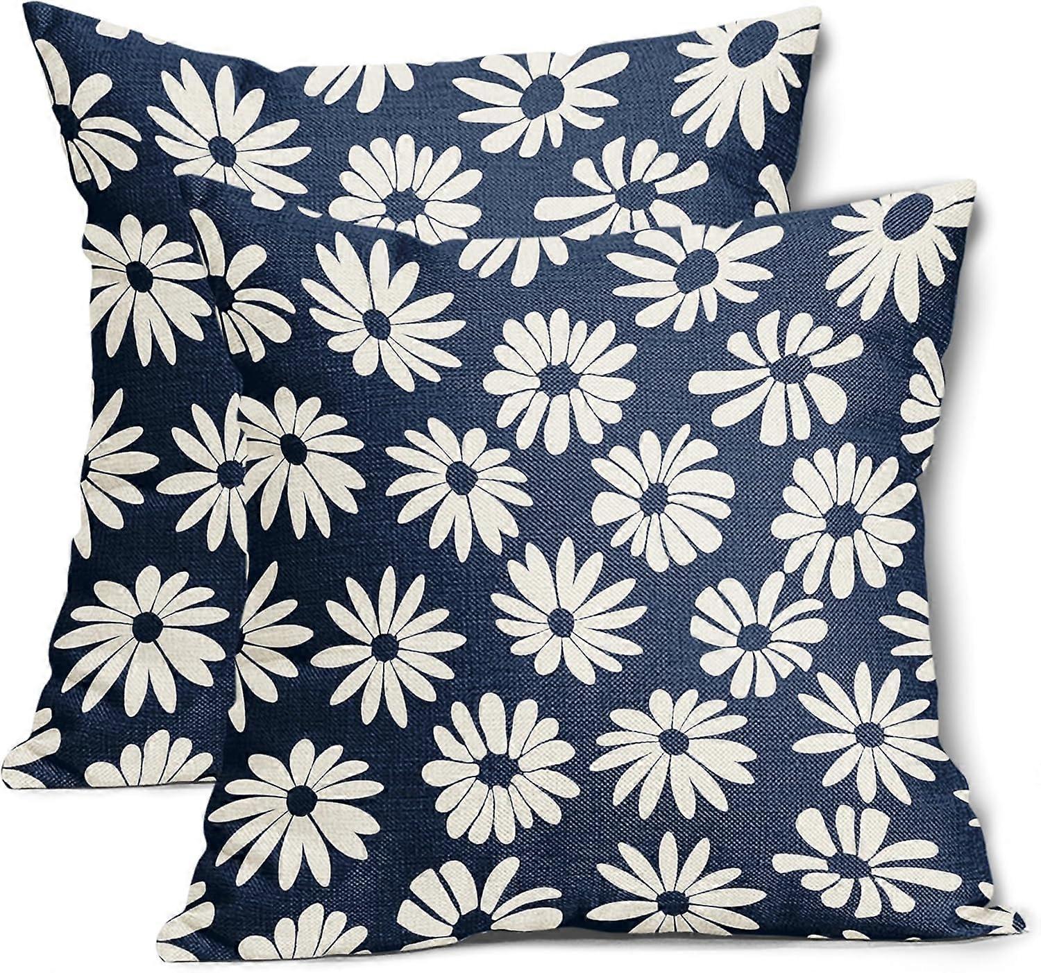 Navy Blue Pillow Covers 16X16 Inch White Floral Daisy Geometry Decorative Couch Pillow Cases Spring Summer Flower Throw Pillows Set of 2 Farmhouse Hom