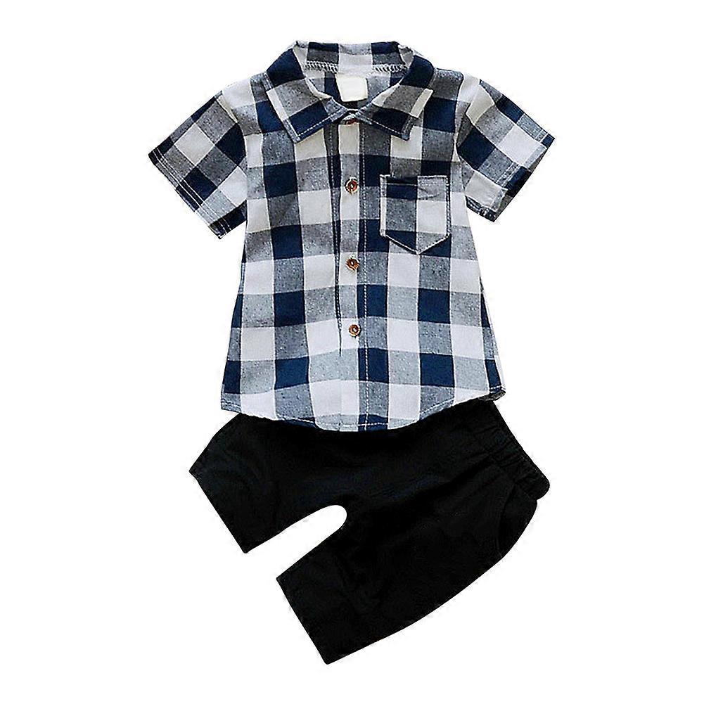 Children's Plaid Shirt Summer Short Sleeve Shirt + Shorts Outfit 2 Pcs Clothes Set(Blue 90)