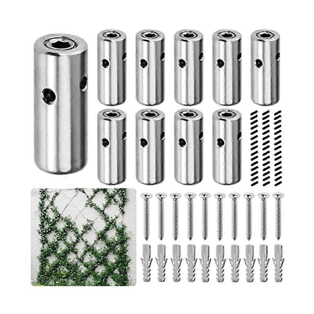 Modern Style Trellis - Our wire trellis has a modern style that complements any environment. It leverages the wall to support plants so that the aesthetic focus would be on the plants, creating a minimalist look that emphasizes the beauty of the plants. More Ventilation - After installation, the distance between the climbing plants and the wall is 2 inches, which provides more space for air circulation behind the climbing plants. This contributes to the growth of the plants and creates a poetically beautiful garden . Top Quality - All parts are made of high-quality Material, it's waterproof, sun-resistant, and never rusts. You only need to lay out the grid once and it can be used for a lifetime. Flexible Layouts - The wire trellis system is versatile to allow different layouts depending on the environment or plants, including diamond, square, fan, or combination. This trellis kit can be expanded with other sets. set: set B-1 x cylindrical +10 set screws and expansion anchors+1 x wrench+40 x PVC end Material: stainless steel + plastic colour: silver Package Contents: 10 x cylindrical 10 sets screws and plastic expansion anchors 1 x Hex wrench 40 x PVC end Only the above package content, other products are not included. Note: Light reflection and different displays may cause the color of the item in the picture a little different from the real thing. The measurement allowed error is +/- 1-3cm.