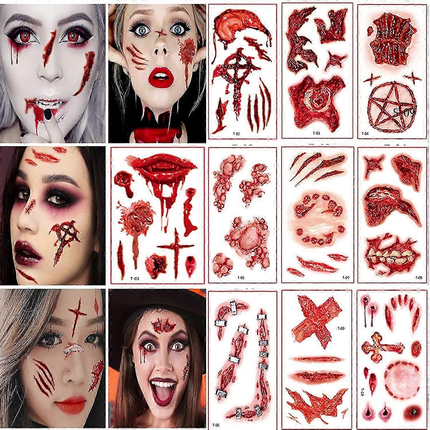 10 Sheets Halloween Tattoo Stickers, Realistic Terror Fake Bloody Wound Stitch Face Chest Scar Scab Waterproof for Halloween Masquerade Prank Makeup P